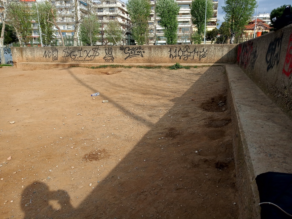 Πρόκειται για ένα χωμάτινο περιφραγμένο οικόπεδο, όπου δεν υπάρχουν κάποιες κατασκευές ή δένδρα που να δημιουργούν μία καλαισθησία αλλά και λειτουργικότητα στο χώρο. Τον τόνο βέβαια δίνουν τα σκαμμένα σημεία και οι τρύπες στο χώμα, που έχουν ανοίξει παίζοντας οι σκύλοι.