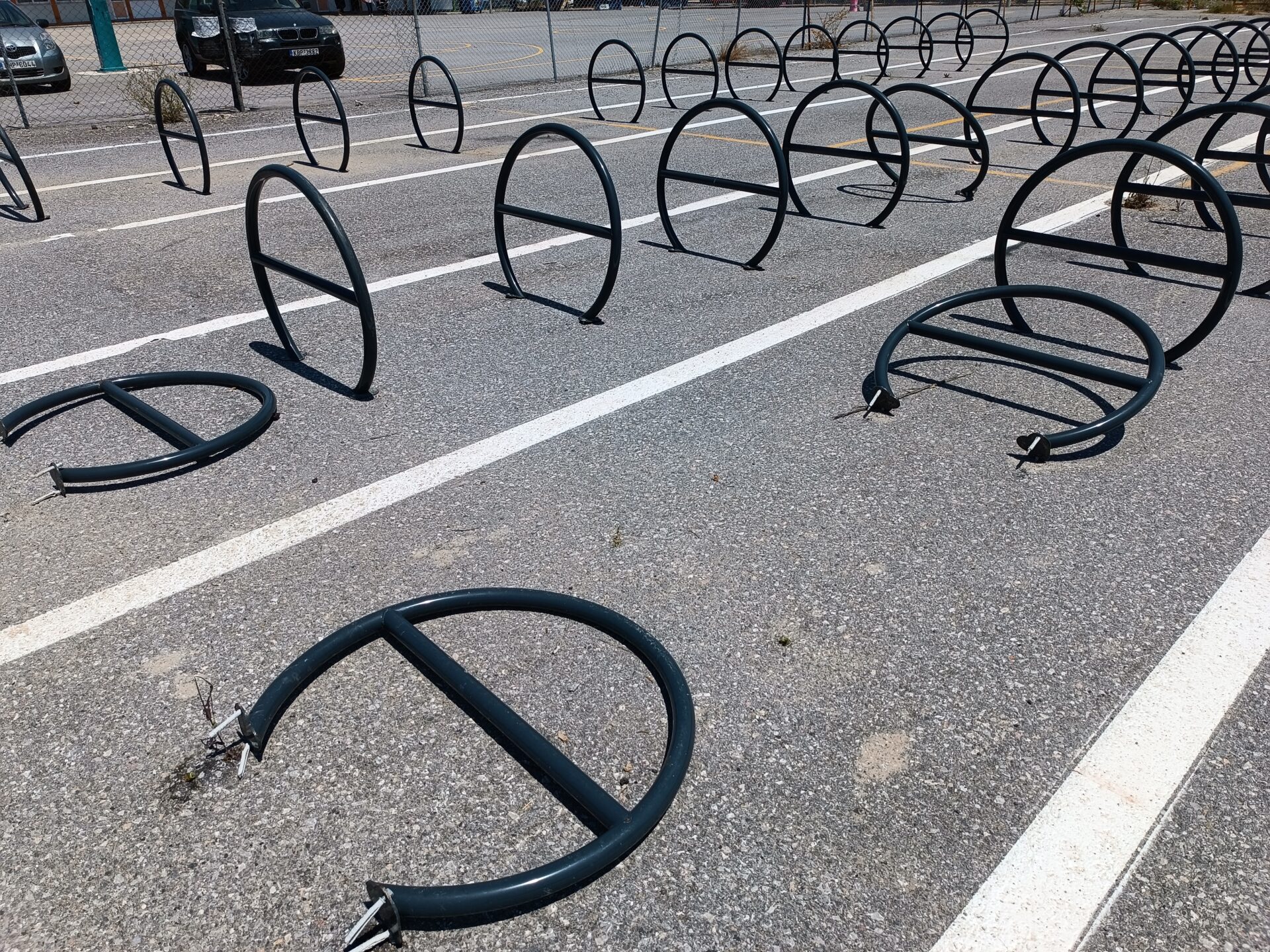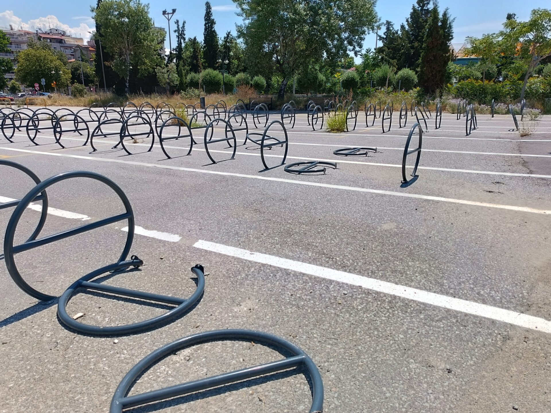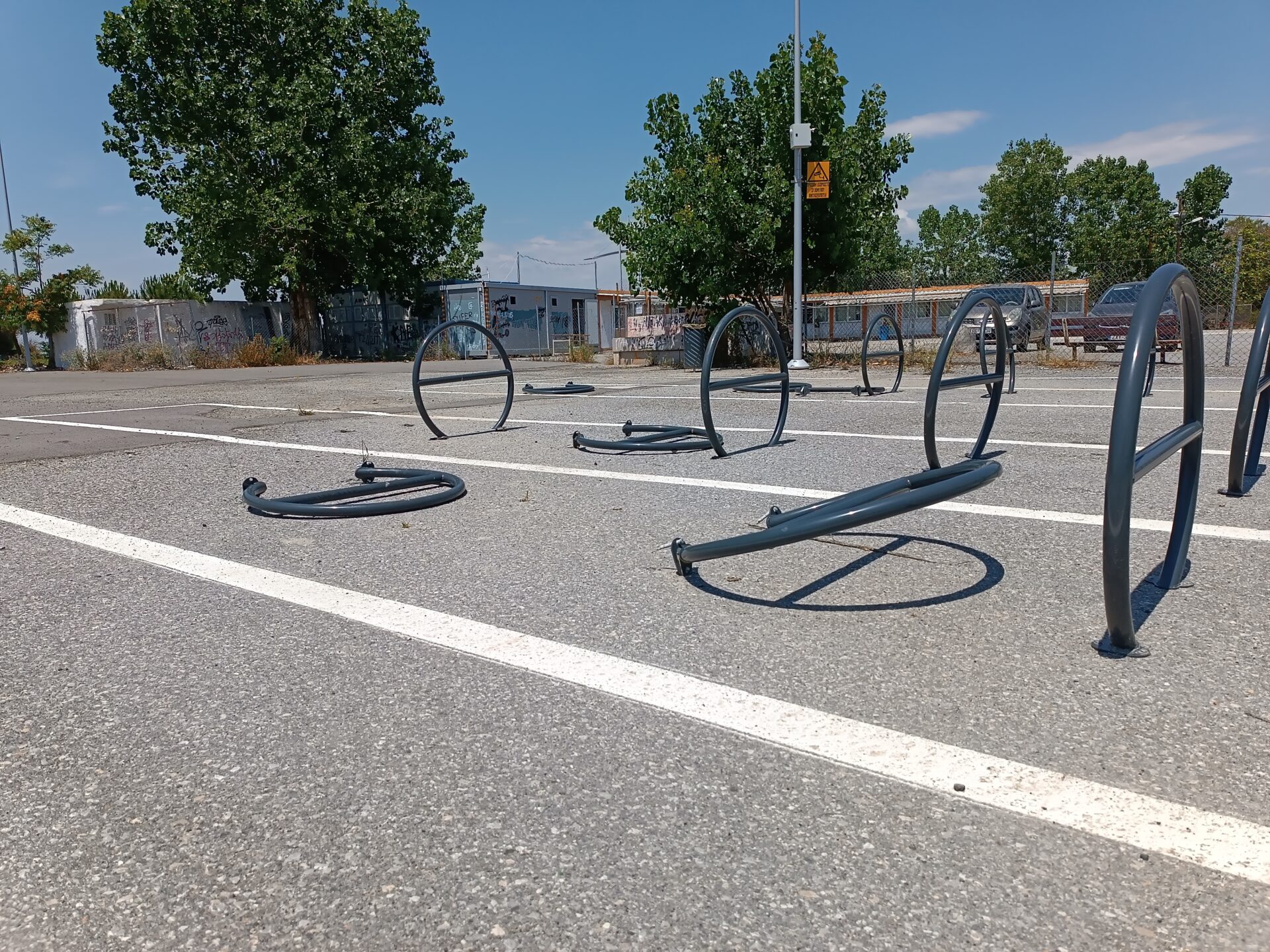 Πολλές από τις μπάρες στάθμευσης ποδηλάτων έχουν ξηλωθεί, προφανώς από διάφορους ασυνείδητους που έχουν επιδοθεί σε πλιάτσικο, ενώ ακόμα και οι πινακίδες που προειδοποιούσαν ότι ο χώρος φυλάσσεται από κάμερες παρακολούθησης, έχουν αποκαθηλωθεί και πεταχτεί στο έδαφος.