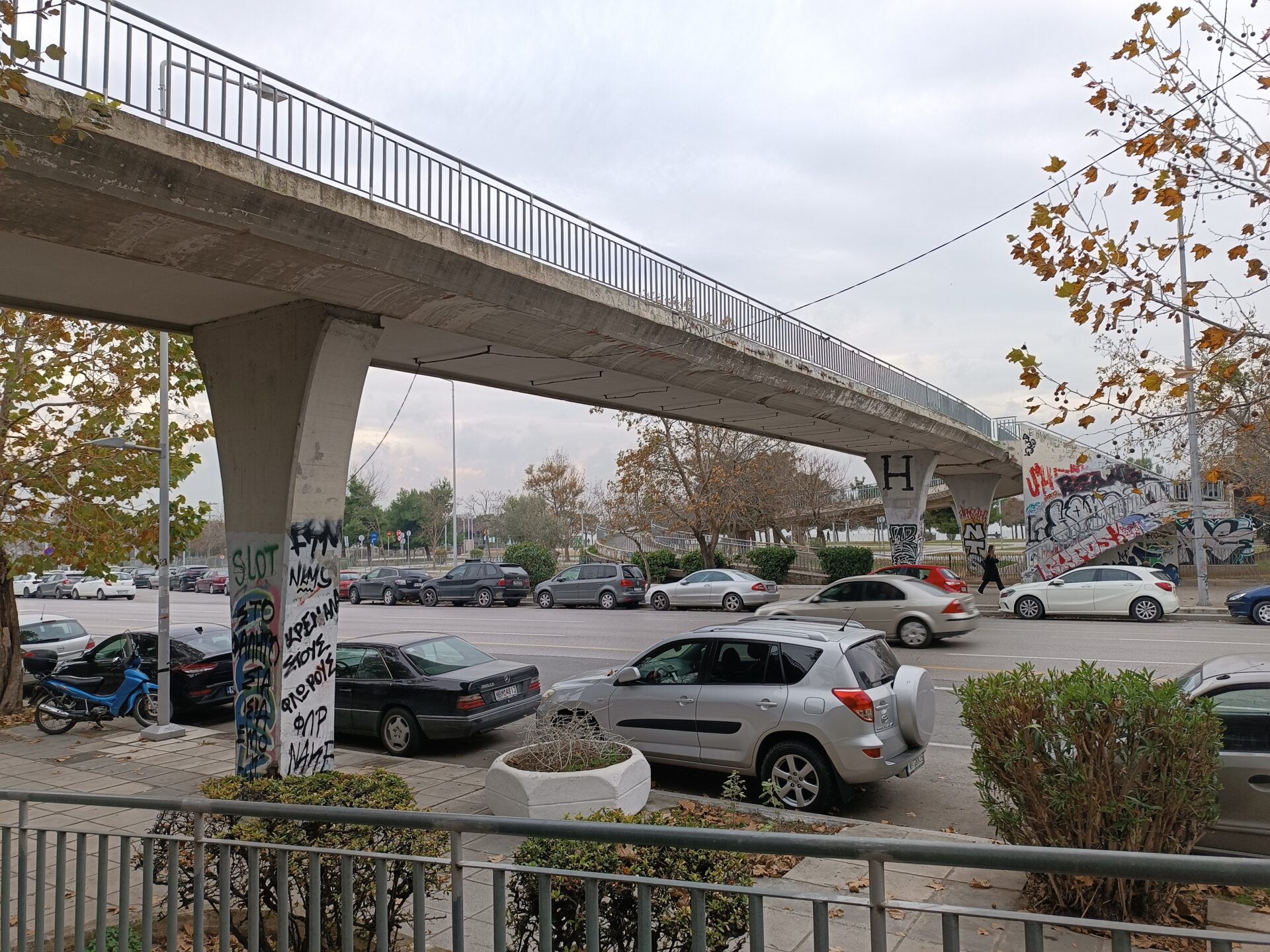 Σημαντικές φθορές και διαβρώσεις παρουσιάζει η γνωστή πεζογέφυρα στην παραλιακή λεωφόρο Μεγάλου Αλεξάνδρου, που δεσπόζει δίπλα στο ξενοδοχείο Μακεδονίας Παλλάς.