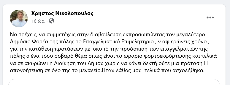 Έχω ξεκαθαρίσει από την πρώτη στιγμή πως μέλημά μας είναι η βιωσιμότητα και η ανταγωνιστικότητα των επιχειρήσεων της πόλης, η ανάταξη της τοπικής οικονομίας. Επιστρέφω τους χαρακτηρισμούς περί δήθεν ¨προσχηματικής¨ διαβούλευσης και καλώ τους επαγγελματίες στο τραπέζι του διαλόγου, το οποίο ποτέ δεν έχω εγκαταλείψει.