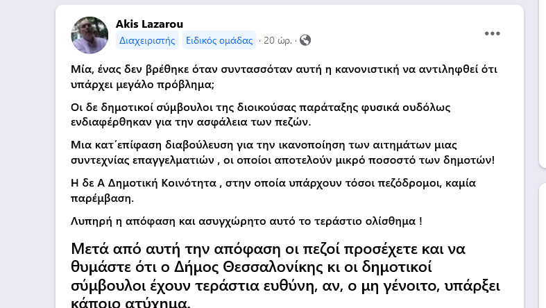 Αξιοσημείωτη είναι και η παρέμβαση του προέδρου του σωματείο «Φίλοι του Ιστορικού Κέντρου της Θεσσαλονίκης» Ακη Λαζάρου ο οποίος σε δηλώσεις του έθεσε το θέμα της επικινδυνότητας που δημιουργείται με τις φορτοεκφορτώσεις από φορτηγά μέχρι 3,5 τόνους στους πεζόδρομους τις εργάσιμες μέρες από τις 10 πμ μέχρι τις 12 το μεσημέρι.
