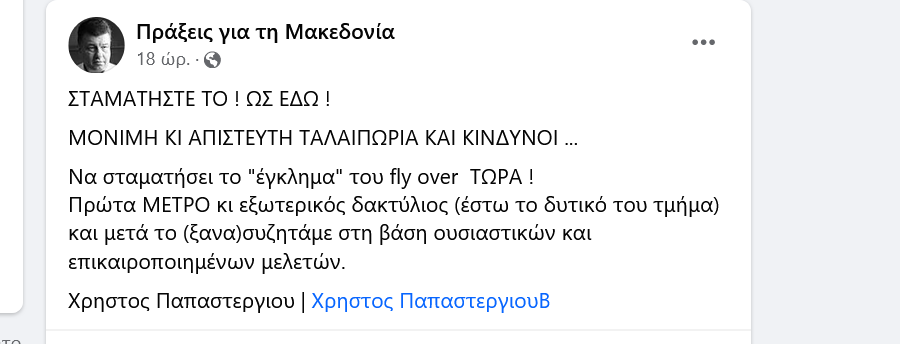 Παπαστεργίου: Να σταματήσει το “έγκλημα” του fly over ΤΩΡΑ !