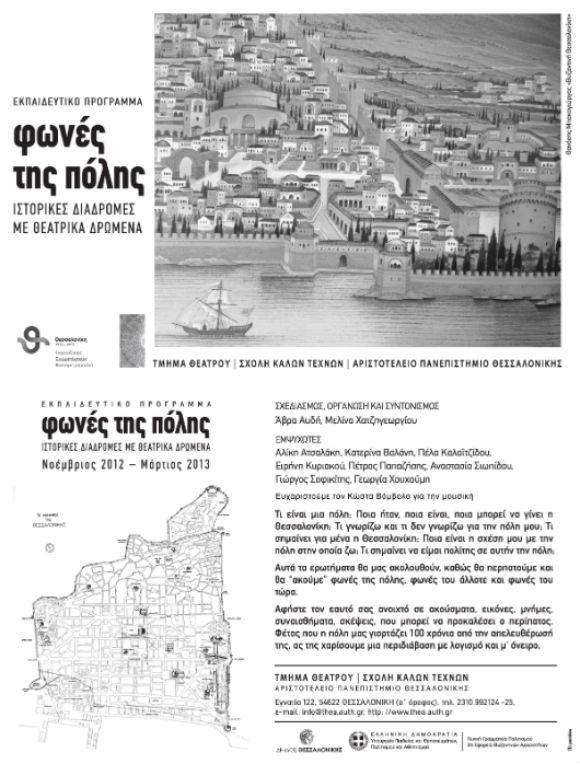 Αλλά πρώτα ας γράψουμε ότι είναι ένας εκπαιδευτικός περίπατος με θεατρικά δρώμενα από φοιτητές του Τμήματος Θεάτρου. Ότι δίνει την ευκαιρία σε μαθητές της δευτεροβάθμιας εκπαίδευσης να βιώσουν την ιστορία της Θεσσαλονίκης, να διερευνήσουν την έννοια της πόλης, να ενδιαφερθούν για τα κοινά, να δημιουργήσουν, να αγαπήσουν την πόλη. – Και φυσικά να αναφέρουμε ότι οργανώθηκε με την ευκαιρία του εορτασμού της πόλης από το Τμήμα Θεάτρου σε συνεργασία με το Δήμο Θεσσαλονίκης.