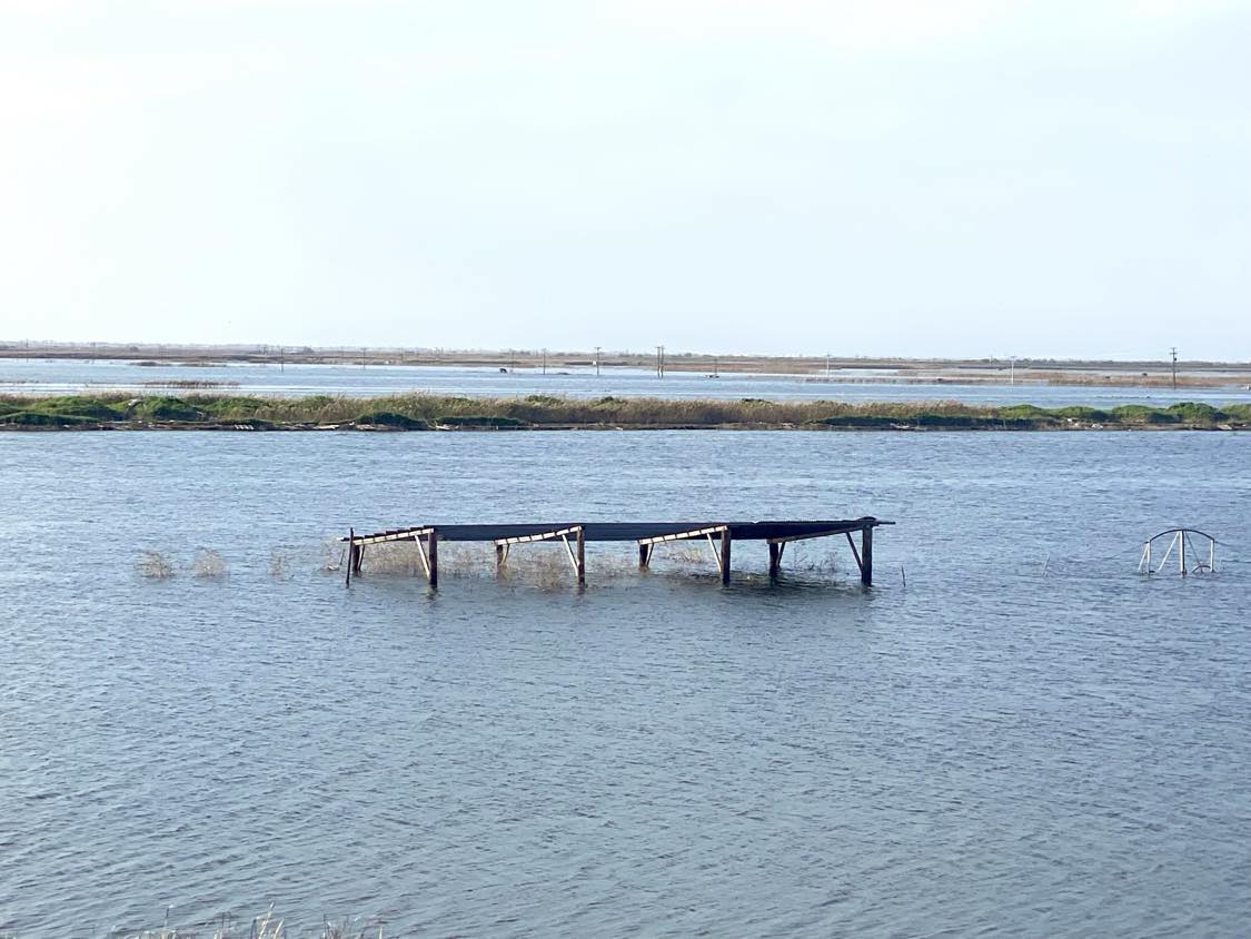 Όσο πλησιάζεις προς το κέντρο της λίμνης η εικόνα χειροτερεύει. Ακολουθώ το ανάχωμα που πλέον βρίσκεται εντός της. Συνδέει τα χωριά μεταξύ τους, αλλά μέσα από νερό. Οι εικόνες που βλέπω είναι εξωπραγματικές. Ολόκληρες εκτάσεις με αμυγδαλιές και ελιές μέσα στο νερό. Νεκρές. Σαν απολιθωμένα δάση. Βυθισμένα μηχανήματα. Εκατοντάδες χιλιάδες μέτρα μαύρα λάστιχα. Κολώνες που ξεχωρίζει μόνο το πάνω μέρος τους. Μικρά νησάκια με δέντρα που δημιουργήθηκαν στο πουθενά.