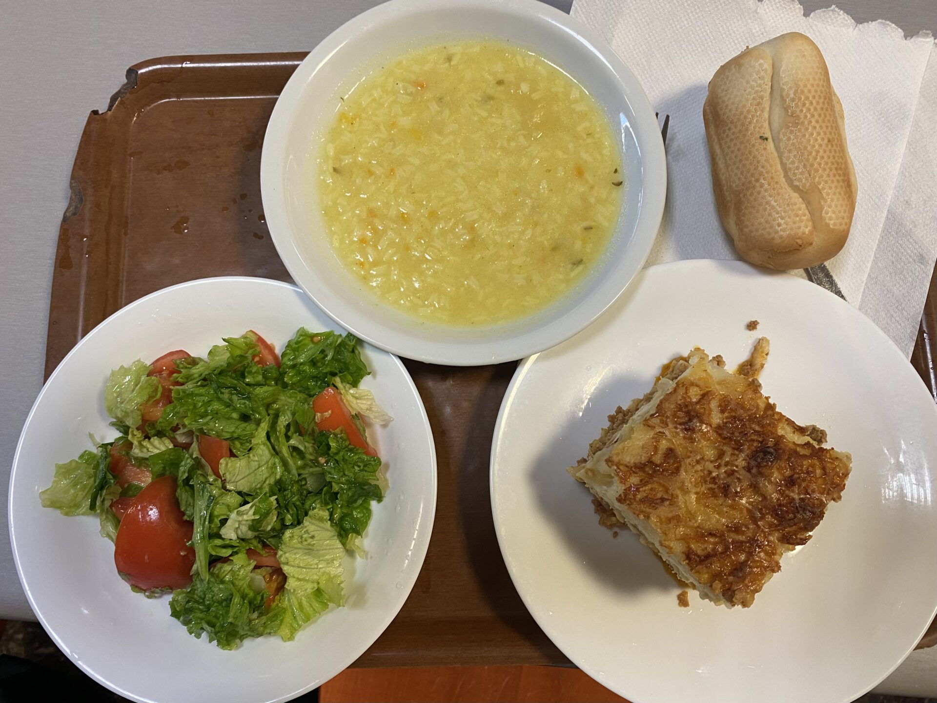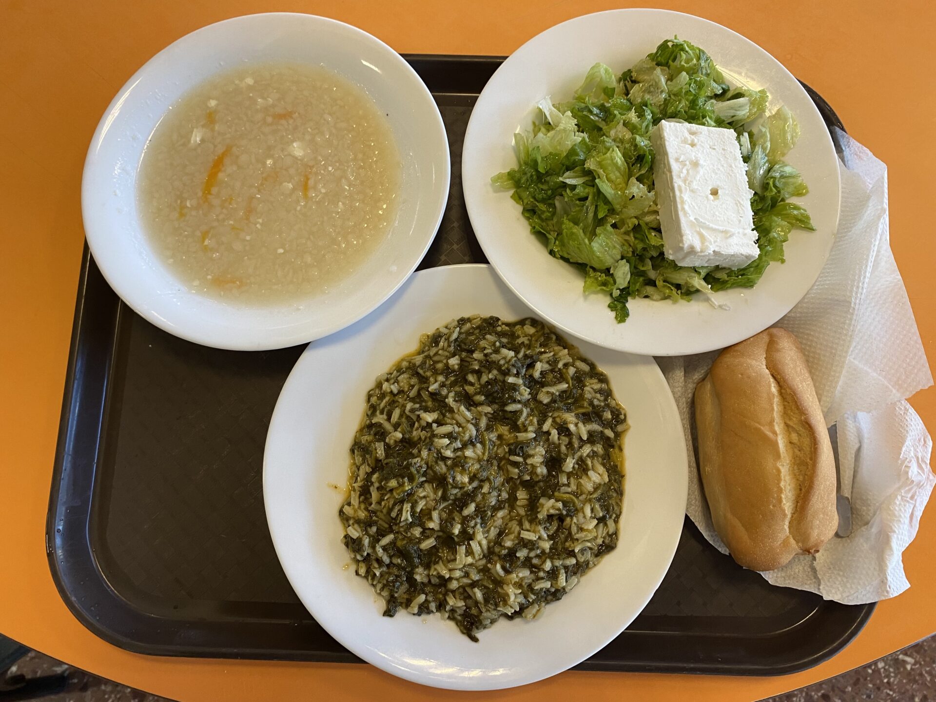 Το μεσημεριανό, έχει 4 διαφορετικές επιλογές κυρίως πιάτου: συνήθως πρόκειται για 2 πιάτα με κρεατικά και δυο “πράσινες” επιλογές που επί της ουσίας πρόκειται για το ίδιο πιάτο, με τη διαφορά ότι το ένα είναι vegan/ νηστίσιμη επιλογή. Υπάρχει επίσης πρώτο πιάτο, σαλάτα και ως επιδόρπιο είτε κάποιο γλυκό είτε κάποιο φρούτο.