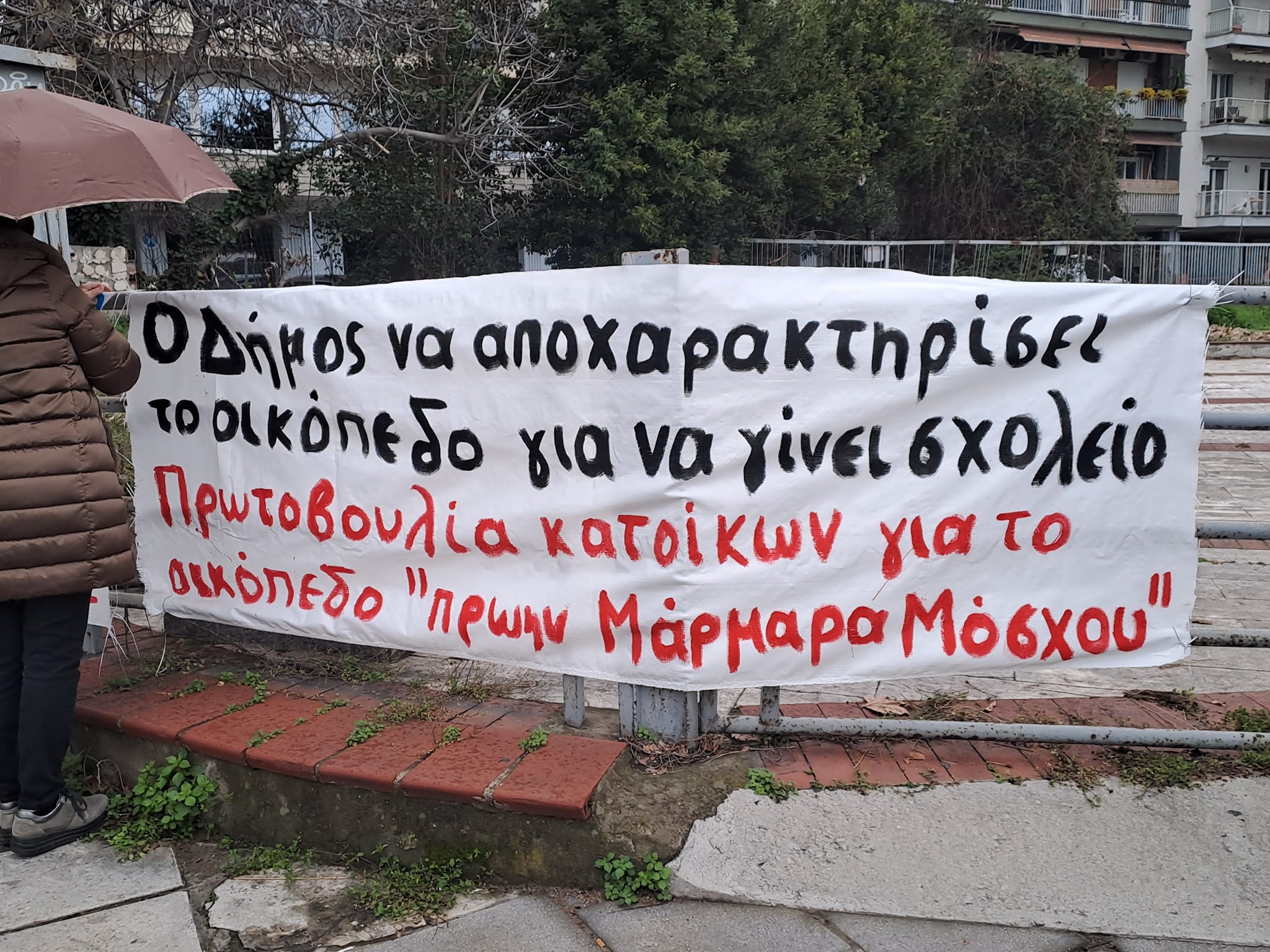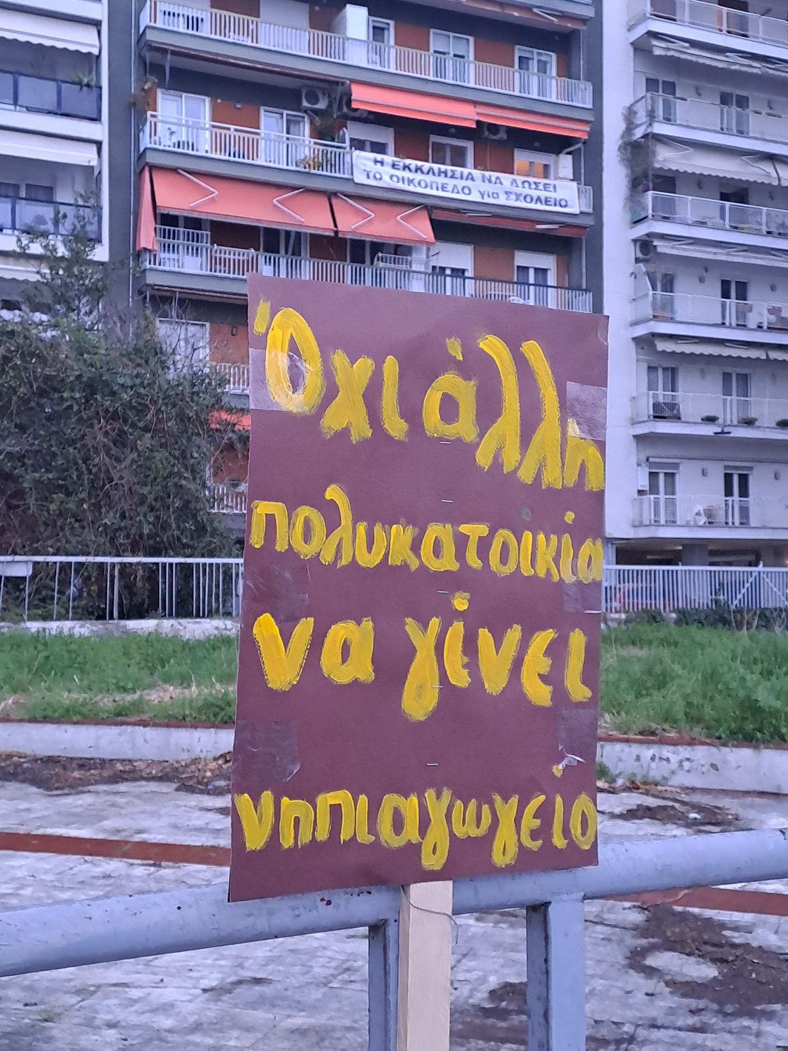 Ζητούν δε, “από τον Δήμο Θεσσαλονίκης, να επαναχαρακτηρισθεί άμεσα το οικόπεδο ως χώρος ανέγερσης νηπιαγωγείου-με ενδεχόμενη πρόβλεψη και για υπόγειο χώρο στάθμευσης αυτοκινήτων (2+ υπόγειοι όροφοι γκαράζ). Αυτή η λύση θα αντιμετώπιζε τόσο το χρόνιο πρόβλημα της έλλειψης σχολικής στέγης στην περιοχή μας, ειδικά για την υποχρεωτική προσχολική εκπαίδευση, όσο και το πρόβλημα της έλλειψης χώρων στάθμευσης γενικότερα στην πόλη μας. Καλούμε την Εκκλησία της Ελλάδος, ιδιοκτήτρια του οικοπέδου, να παραχωρήσει το οικόπεδο στον Δήμο Θεσσαλονίκης για να ανεγερθεί νηπιαγωγείο”.