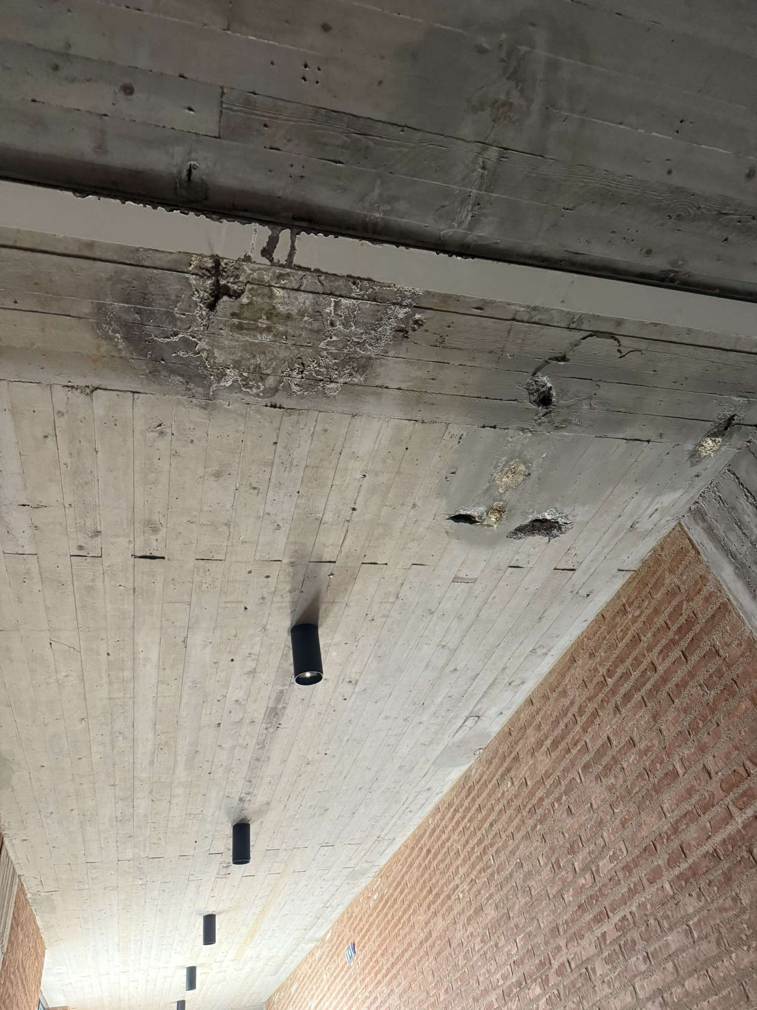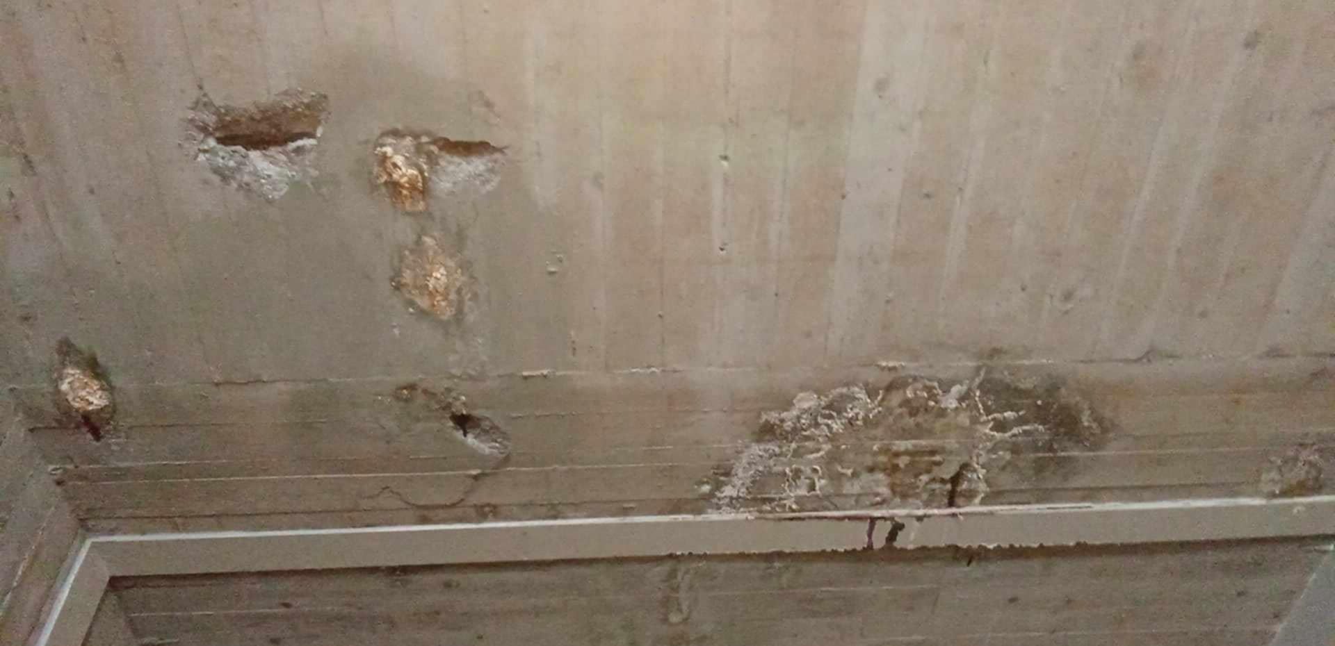 Το περιστατικό θα μπορούσε να θεωρηθεί ήσσονος σημασίας αν δεν παρατηρούνταν αλλοιώσεις σε αρκετά σημεία της οροφής του κτιρίου όπως διαπιστώσαμε μετά από επιτόπια έρευνα. Υπάρχουν πολλά σημεία με υγρασίες, μερικές από τις οποίες εμφανίστηκαν εκτεταμένα την ίδια χρονική στιγμή και σε άλλες αίθουσες καθώς και σημεία στα οποία έχει υποχωρήσει το τσιμέντο και εμφανίστηκαν ακόμα και τα εσωτερικά σίδερα. Εμφανή είναι τα προβλήματα απορρόφησης των υδάτων λόγω ελλιπούς κλίσης.