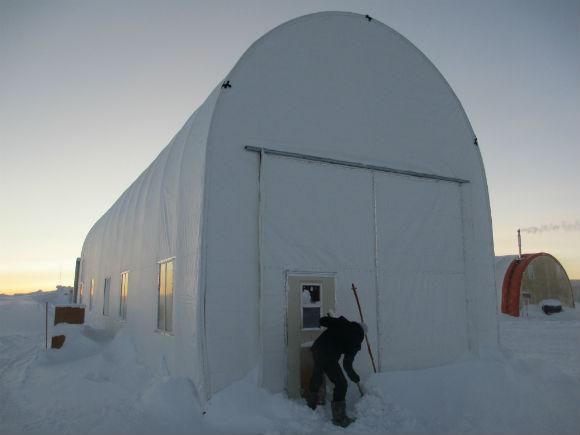 Σε αυτήν εδώ τη λευκή τέντα κάνουν επιστημονικές έρευνες στο έδαφος. Πρέπει να ξέρεις ότι η βάση βρίσκεται σε υψόμετρο 3.330 μ. όχι γιατί είμαστε σε βουνό αλλά γιατί από κάτω μας βρίσκεται πάγος εκατοντάδων χιλιάδων χλμ. Δεν πατάμε στη γη δηλαδή!