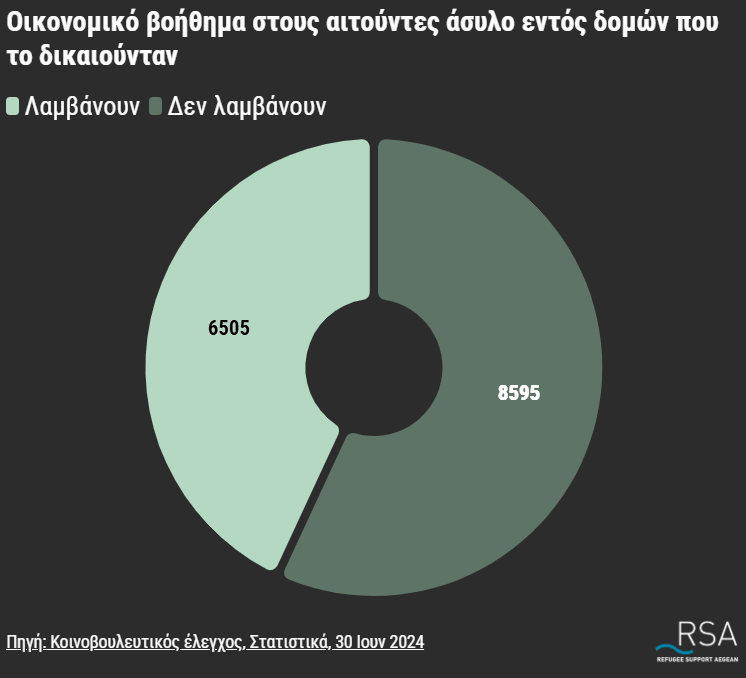 Από τα στοιχεία που δίνει στη δημοσιότητα το RSA ως προς τη λήψη του οικονομικού βοηθήματος προκύπτει ότι την 30η Ιουνίου 2024, από τα 15.100 άτομα που διέμεναν σε καμπ και ταυτόχρονα δικαιούνταν οικονομικό βοήθημα, μόνο τα 6.505 άτομα το λάμβαναν, ενώ 8.595 άτομα δεν το λάμβαναν αν και το δικαιούνταν (ποσοστό λήψης 43%).