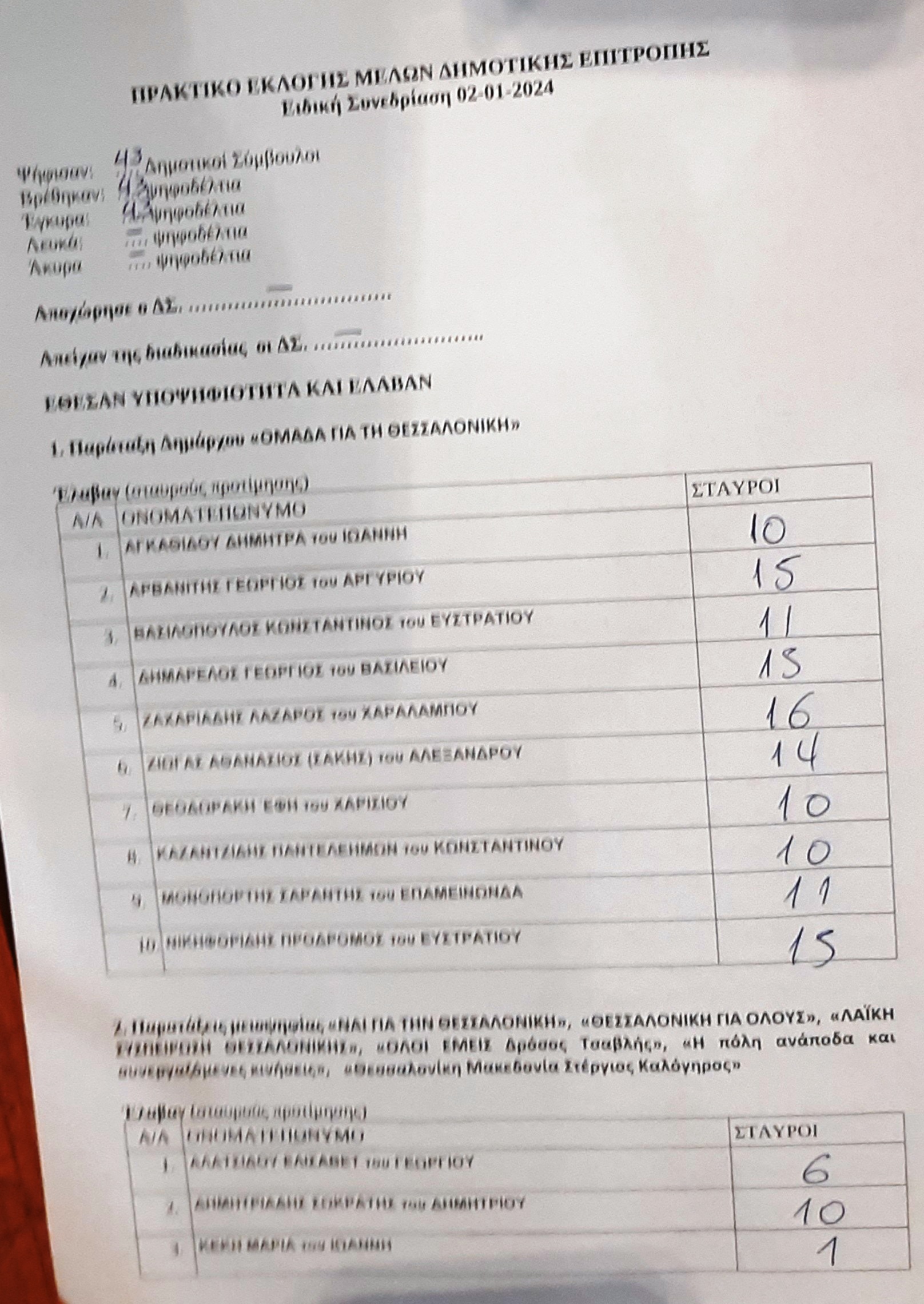 Ωστόσο το αποτέλεσμα της ψηφοφορίας, όπου οι εκλογείς μπορούσαν να ψηφίσουν 3 υποψήφιους, όπως καταγράφηκε στα δύο πρακτικά τα οποία παρουσιάζουμε, δυσαρέστησε σφοδρά τον πρώην δήμαρχο Θεσσαλονίκης και επικεφαλής της μείζονος αντιπολίτευσης Κ. Ζέρβα, ο οποίος σύμφωνα με πληροφορίες έχοντας και την ψήφο του Στέργιου Καλόγηρου, επιδίωκε να αποκλείσει τις άλλες παρατάξεις από τη Δημοτική Επιτροπή.