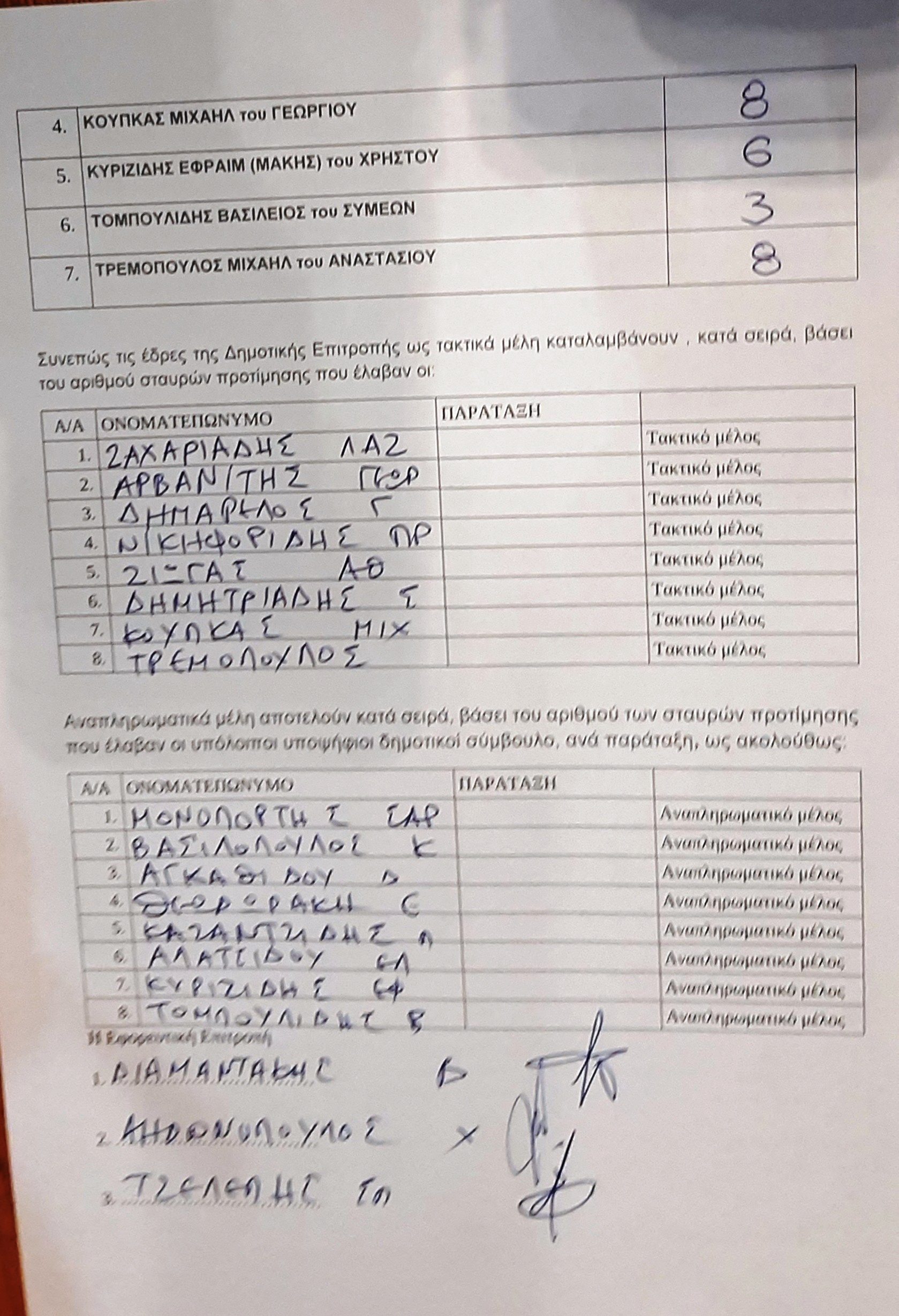 - Από τη διοικούσα παράταξη εξελέγησαν οι αντιδήμαρχοι Λάζαρος Ζαχαριάδης, Γιώργος Αρβανίτης, Γιώργος Δημαρέλος, Πρόδρομος Νικηφορίδης και Αθανάσιος Ζιώγας.