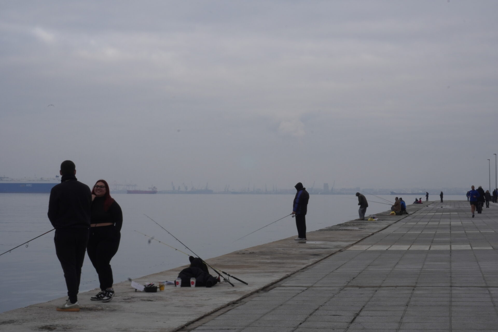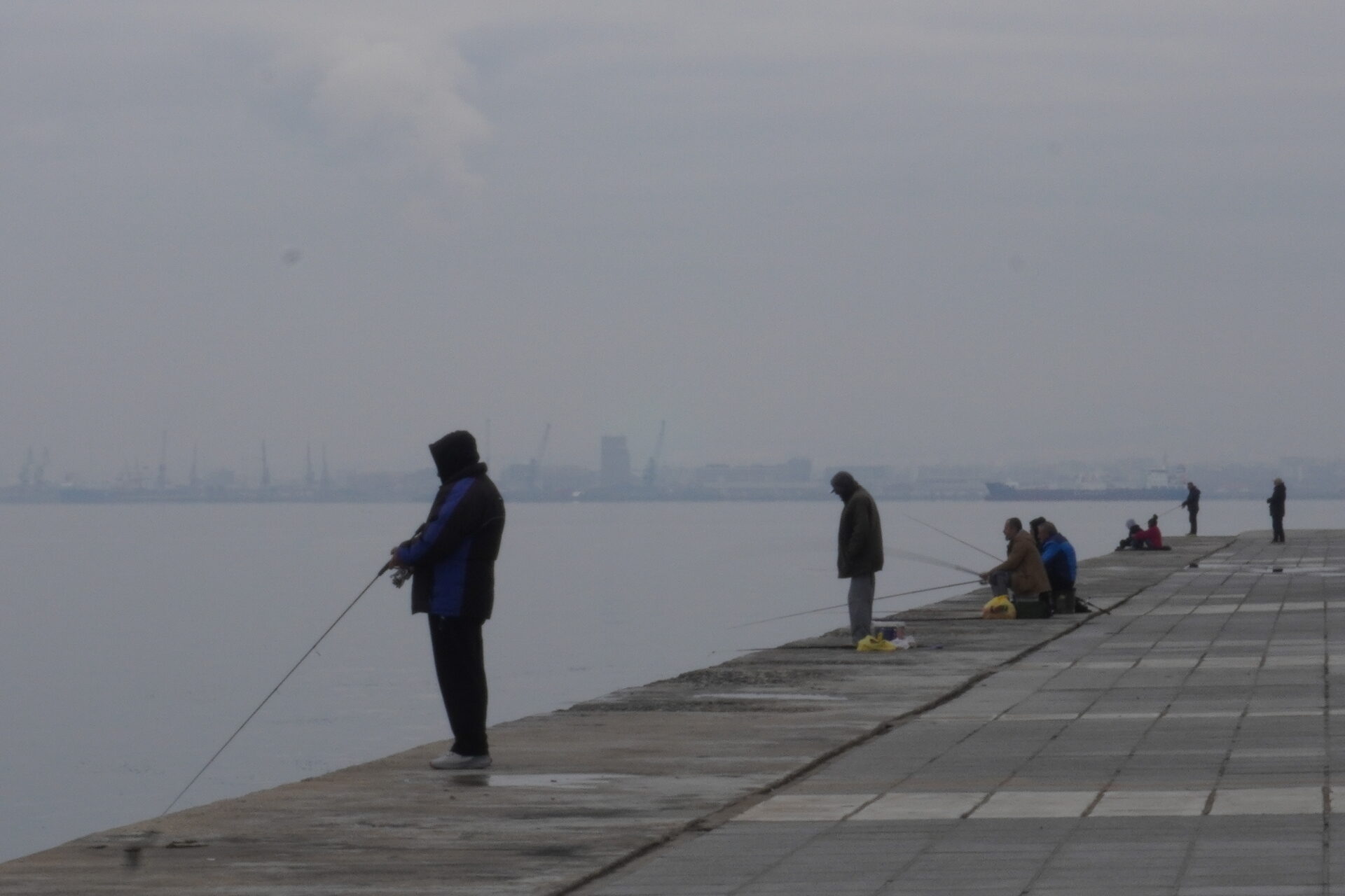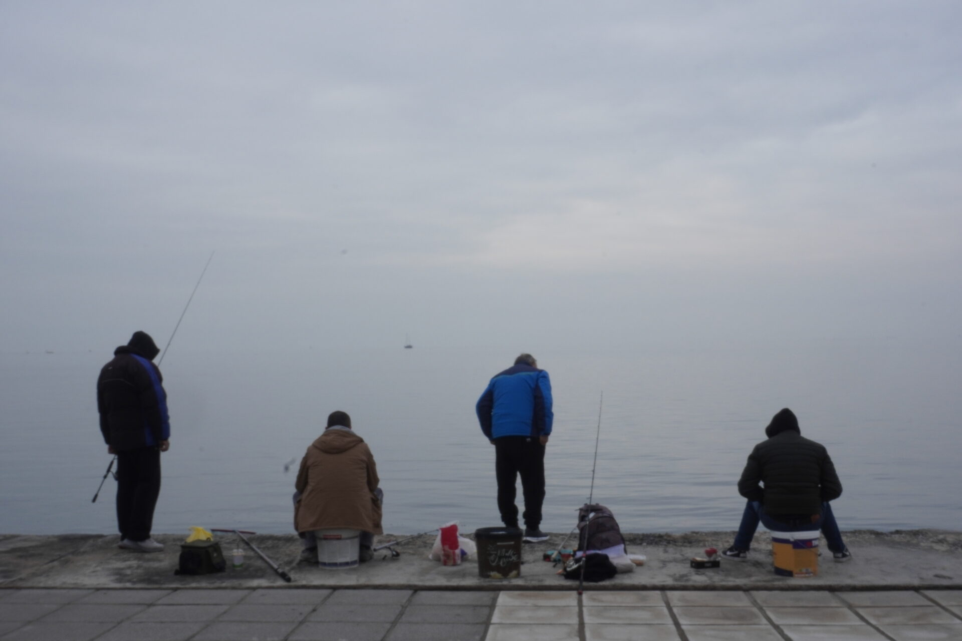Όλοι τους βρίσκονται στον δικό τους κόσμο. Πίσω τους, η πόλη τρέχει: περαστικοί προσπερνούν, αυτοκίνητα κορνάρουν και οι δρόμοι της Θεσσαλονίκης γεμίζουν θόρυβο. Εκείνοι, ωστόσο, μένουν ακίνητοι, με το βλέμμα στη θάλασσα και τη σκέψη σε μια καλή ψαριά.
