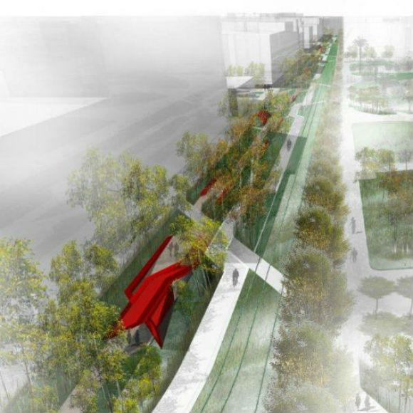 πεζή, ποδήλατο, μέσα μαζικής μεταφοράς και τραμ. Στα άκρα του άξονα, οι δύο σημαντικοί πράσινοι πνεύμονες της πόλης, ο Εθνικός Κήπος και το Πεδίον του Άρεως, επιτρέπουν στον γραμμικό άξονα να αποτελέσει έναν πράσινο διάδρομο σύνδεσης και ανάπτυξης ενός ενιαίου αστικού οικοσυστήματος. Τα σημεία στάσης και εξυπηρέτησης των πεζών οργανώνονται ως «αστικά πολύ-εργαλεία», είναι χώροι όπου ο χρήστης μπορεί να εξυπηρετηθεί πολλαπλώς: να αφήσει με ασφάλεια το ποδήλατό του, να δει πληροφορίες σε χάρτες, να ενημερωθεί μέσω ψηφιακών προβολών, να τηλεφωνήσει, να φορτίσει το κινητό του, να έχει πρόσβαση στο διαδίκτυο. Οι τρεις δημόσιοι χώροι, οι πλατείες Κοραή, Τρίτση και Ομονοίας εντάσσονται στην ενιαία λογική του συστήματος και διαμορφώνονται ως θεματικοί «πυρήνες».