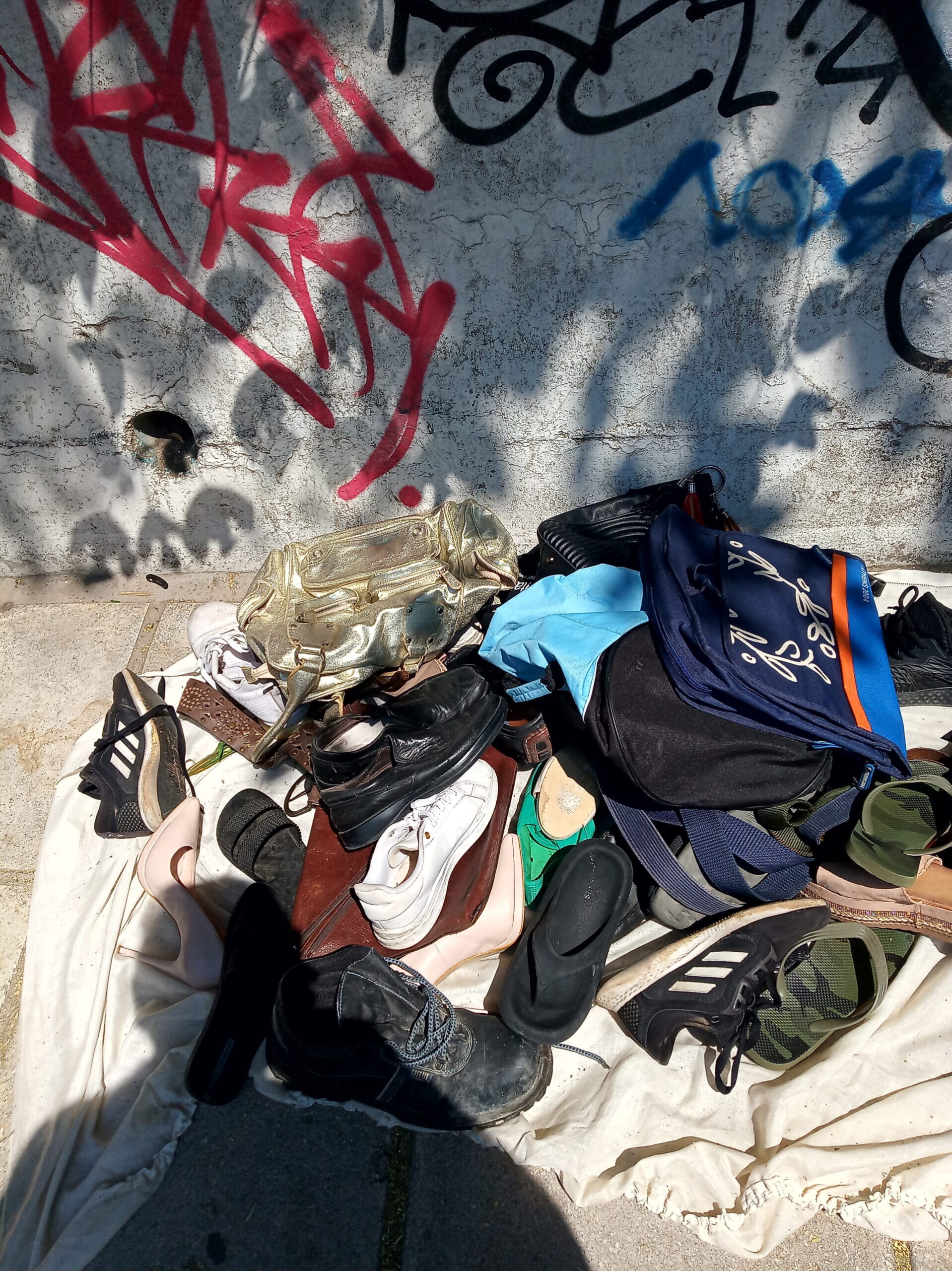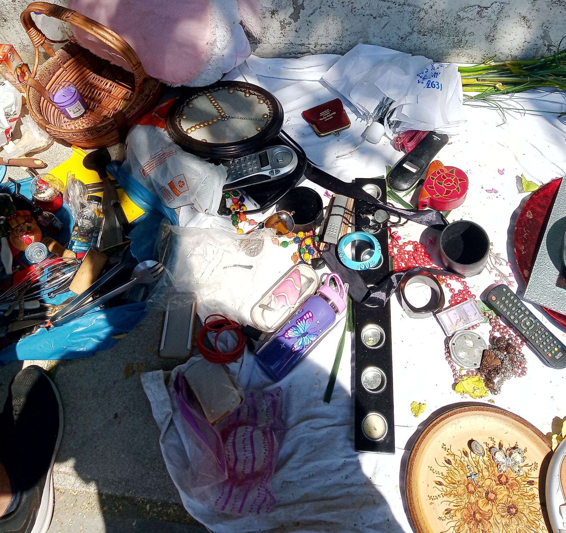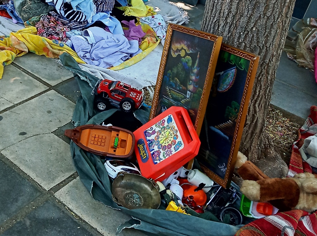 Στην κυριολεξία πρόκειται για σωρούς προϊόντων που αραδιάζονται πάνω σε μεγάλα πανιά, ώστε να μαζευτούν γρήγορα σε μπόγους αν χρειαστεί, η πάνω σε ανοιχτές σακούλες απορριμμάτων, κατά μήκος των πεζοδρομίων, ώστε οι περαστικοί να μπορούν να τα προσεγγίσουν, να παρατηρήσουν, να τα ψηλαφίσουν ή και να τα δοκιμάσουν εύκολα.