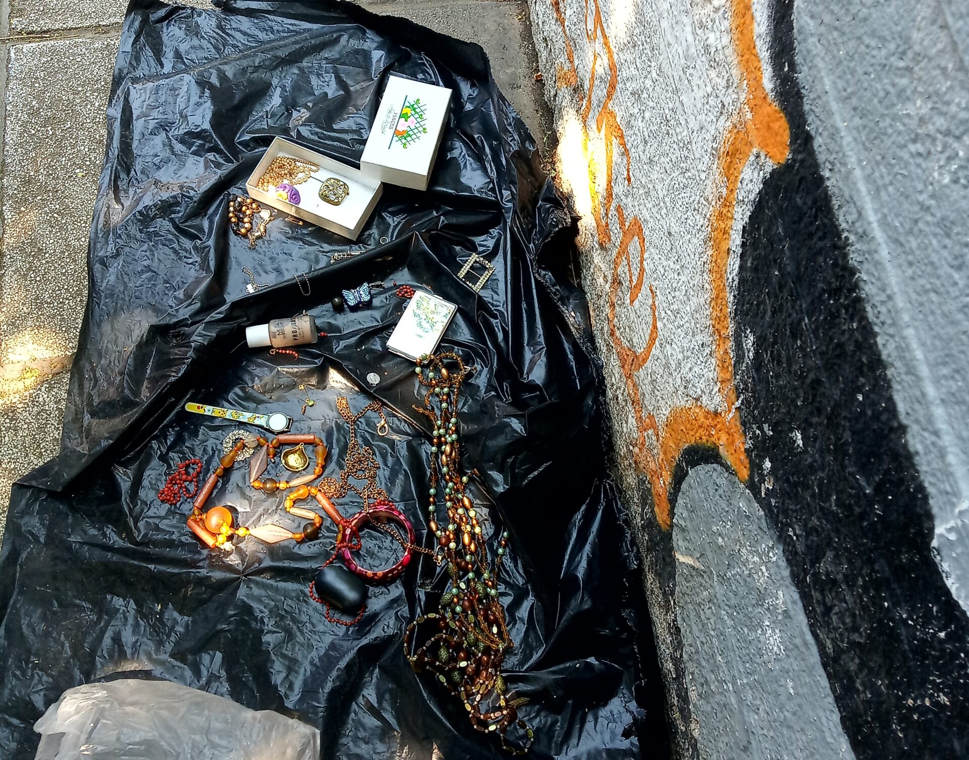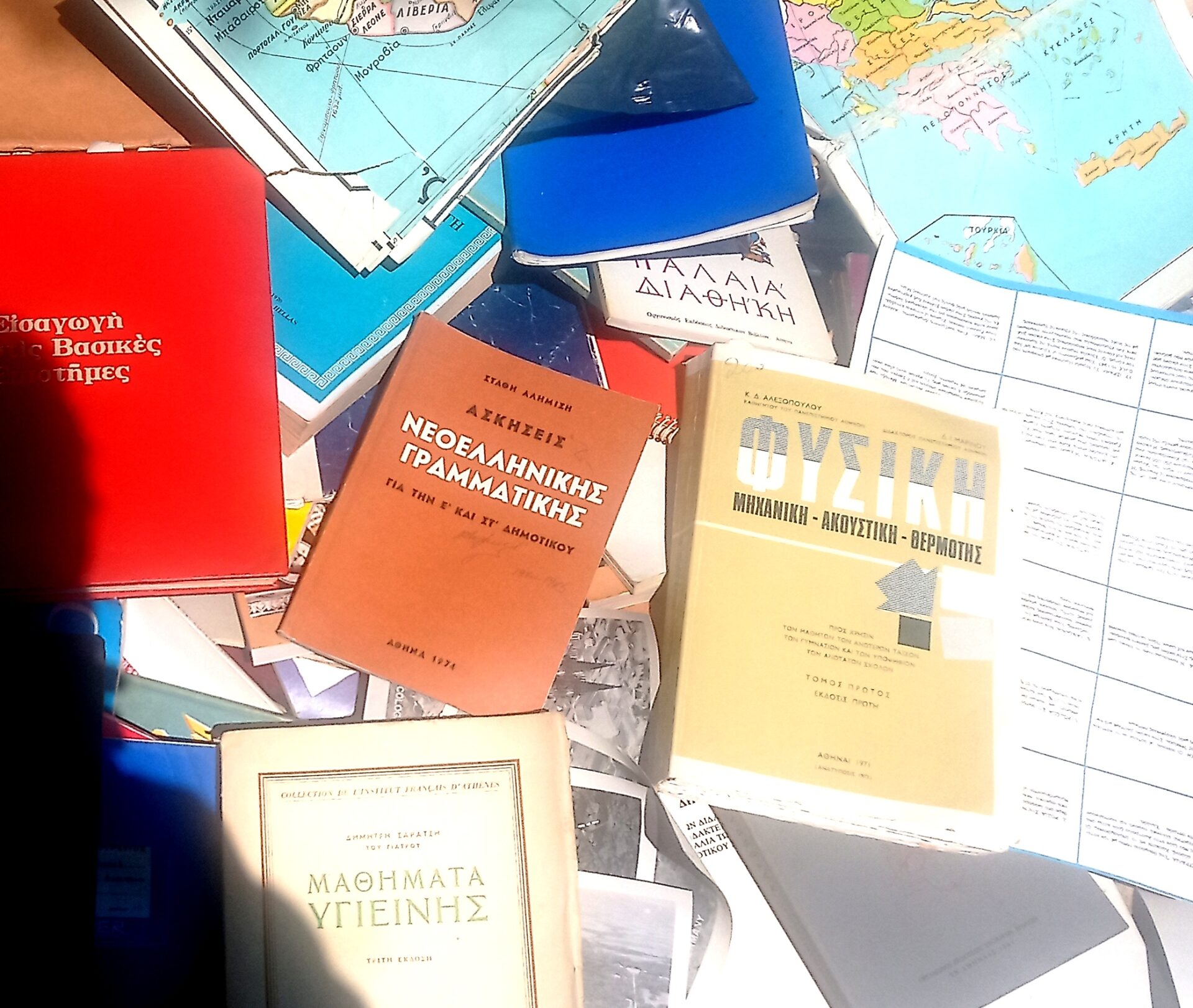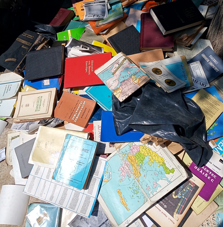 Χαρακτηριστική είναι η περίπτωση των βιβλίων που βρήκαμε σε ένα σωρό, όπου μεταξύ άλλων διακρίναμε μία έκδοση του 1951 του Γαλλικού Ινστιτούτου, τα “Μαθήματα Υγιεινής”, του γιατρού Δημήτρη Σαράτση αλλά και ένα βιβλίο με ασκήσεις Νεοελληνικής Γραμματικής του 1974, όπως και μία “Απολογία Σωκράτους” του Πλάτωνα σε μαλακή έκδοση. Όλα αραδιασμένα πάνω στο πεζοδρόμιο σε ένα σωρό δίπλα σε ένα δένδρο.