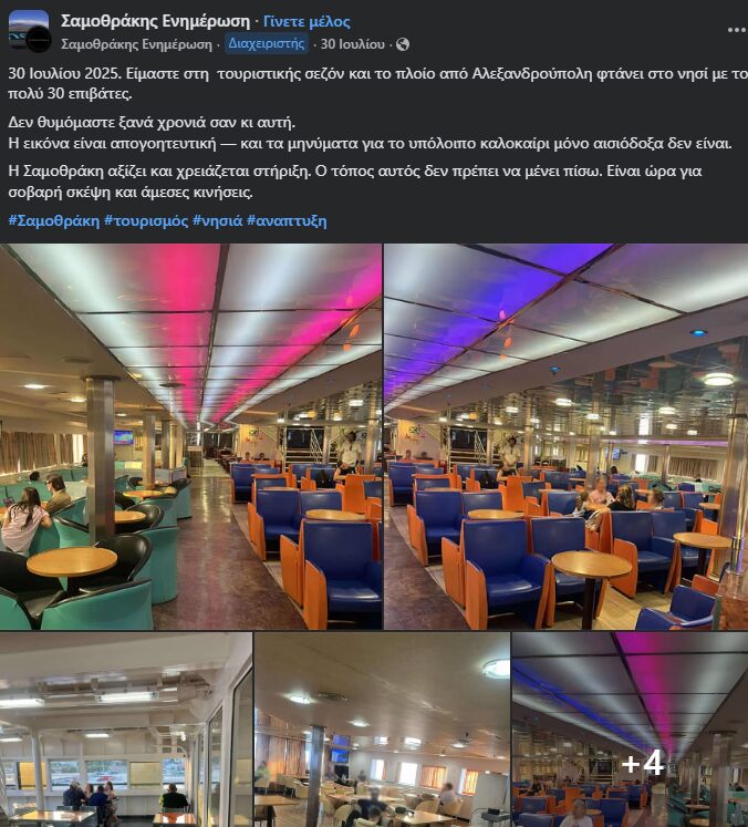 Στις 30 Ιουλίου, αναρτήθηκε σε τοπικό group στο Facebook μία εικόνα από το σαλόνι πλοίου προς τη Σαμοθράκη, στην οποία απεικονιζόταν ελάχιστοι επιβάτες. Στην ανάρτηση εκφραζόταν απογοήτευση και φόβος για την εξέλιξη της σεζόν και γινόταν κάλεσμα για «σοβαρή σκέψη και άμεσες κινήσεις».