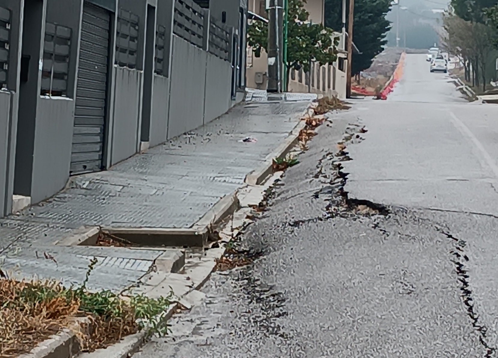 Οι πληροφορίες αναφέρουν ότι στο συγκεκριμένο σπίτι χρειάστηκαν ενέσεις τσιμέντου ώστε να στηριχθεί επαρκώς το οίκημα. Στη φωτογραφία είναι εμφανής η υποχώρηση του δρόμου που διέρχεται δίπλα στο σπίτι.