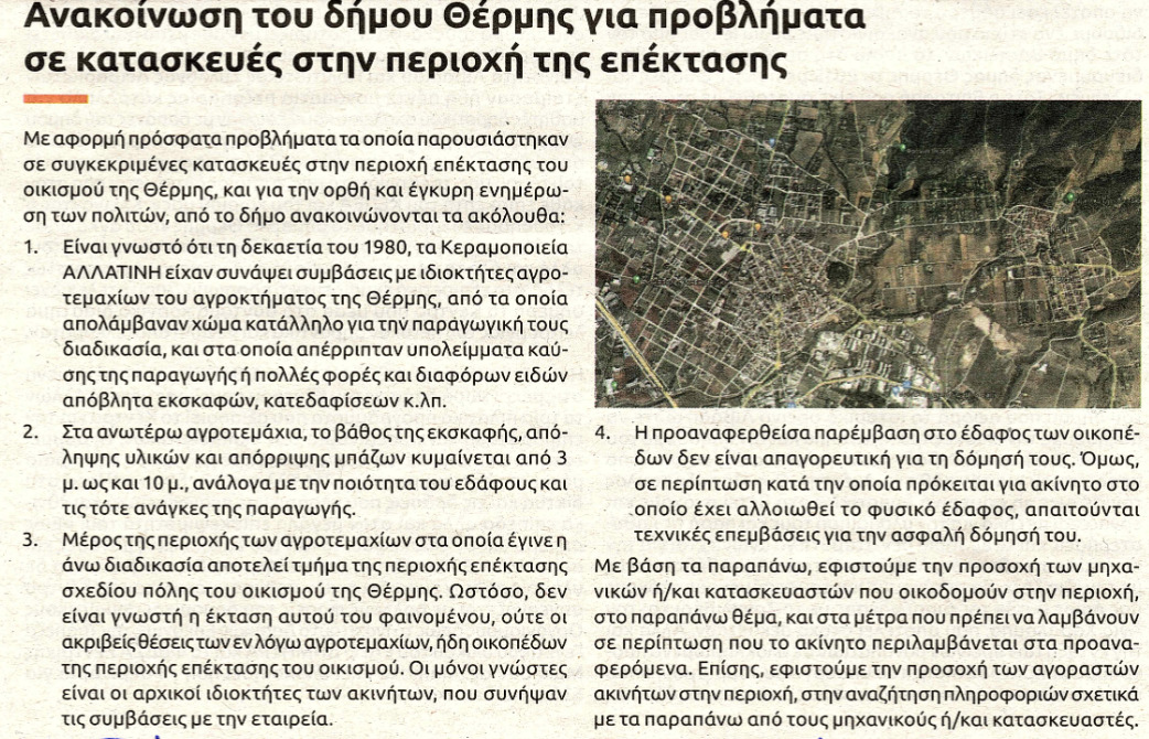 Το καλοκαίρι, μετά προφανώς από διαμαρτυρίες και αναφορές στην οικεία Πολεοδομία, ο δήμος Θέρμης εξέδωσε ανακοίνωση, η οποία δημοσιεύτηκε και στην εφημερίδα του δήμου “Θέρμης Δρώμενα”, προκειμένου να εξηγήσει το φαινόμενο και να επιστήσει την προσοχή, ώστε να μην υπάρξουν προβλήματα στην θεμελίωση των κτισμάτων.