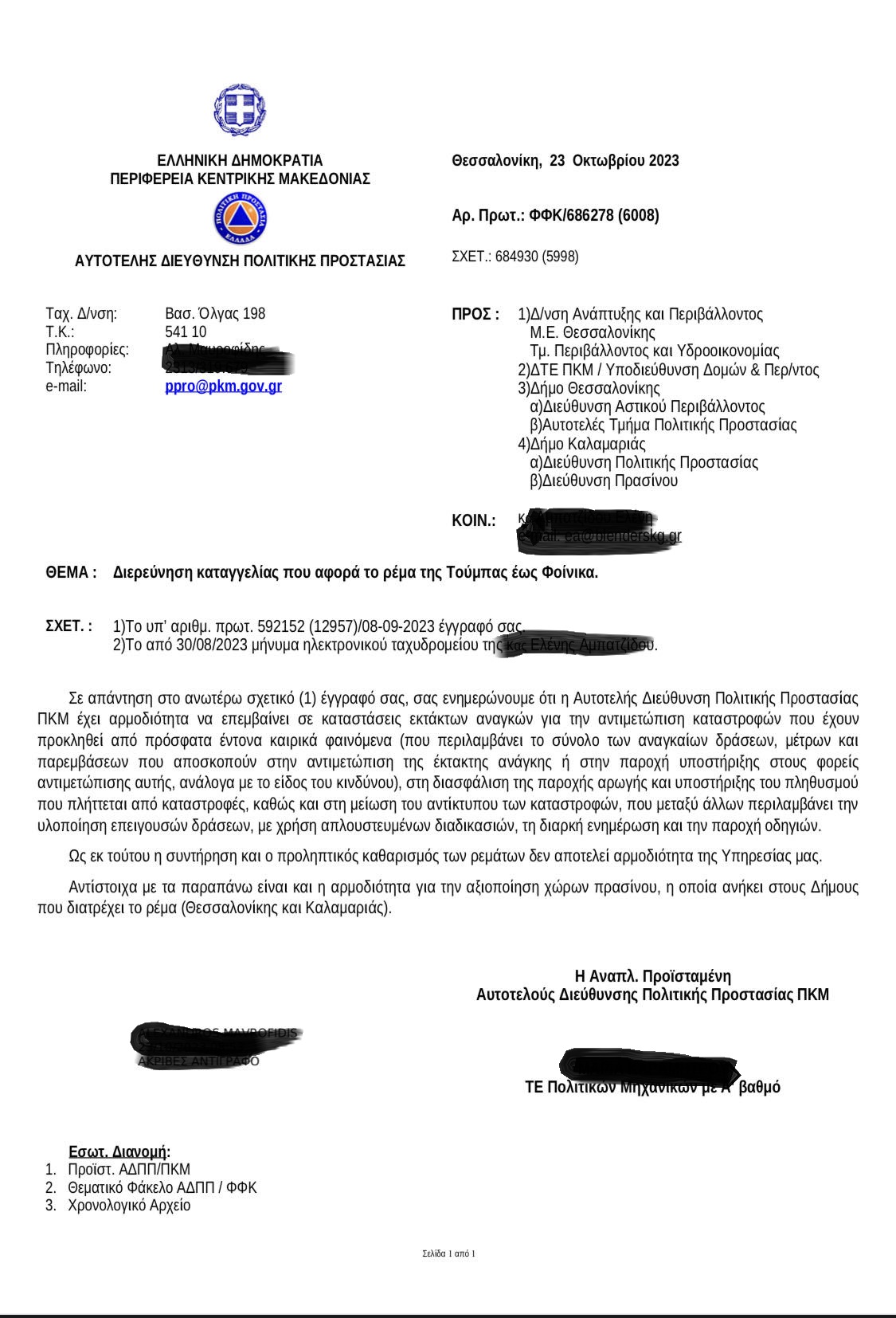 Μετά από καταγγελία της κατοίκου της περιοχής Τούμπας Κ.Α. η οποία αρχικά απευθύνθηκε στον δήμο Θεσσαλονίκης, αναδείχθηκε για μία ακόμη φορά το αλαλούμ των δημόσιων υπηρεσιών. Ο δήμος Θεσσαλονίκης απάντησε ότι ο καθαρισμός των ρεμάτων ανήκει στην Περιφέρεια Κεντρικής Μακεδονίας, αλλά από την Πολιτική Προστασία της ΠΚΜ ανταπάντησαν ότι αρμόδιοι για το ρέμα της Τούμπας, που εκτείνεται μέχρι τον Φοίνικα είναι οι δήμοι Θεσσαλονίκης και Καλαμαριάς.