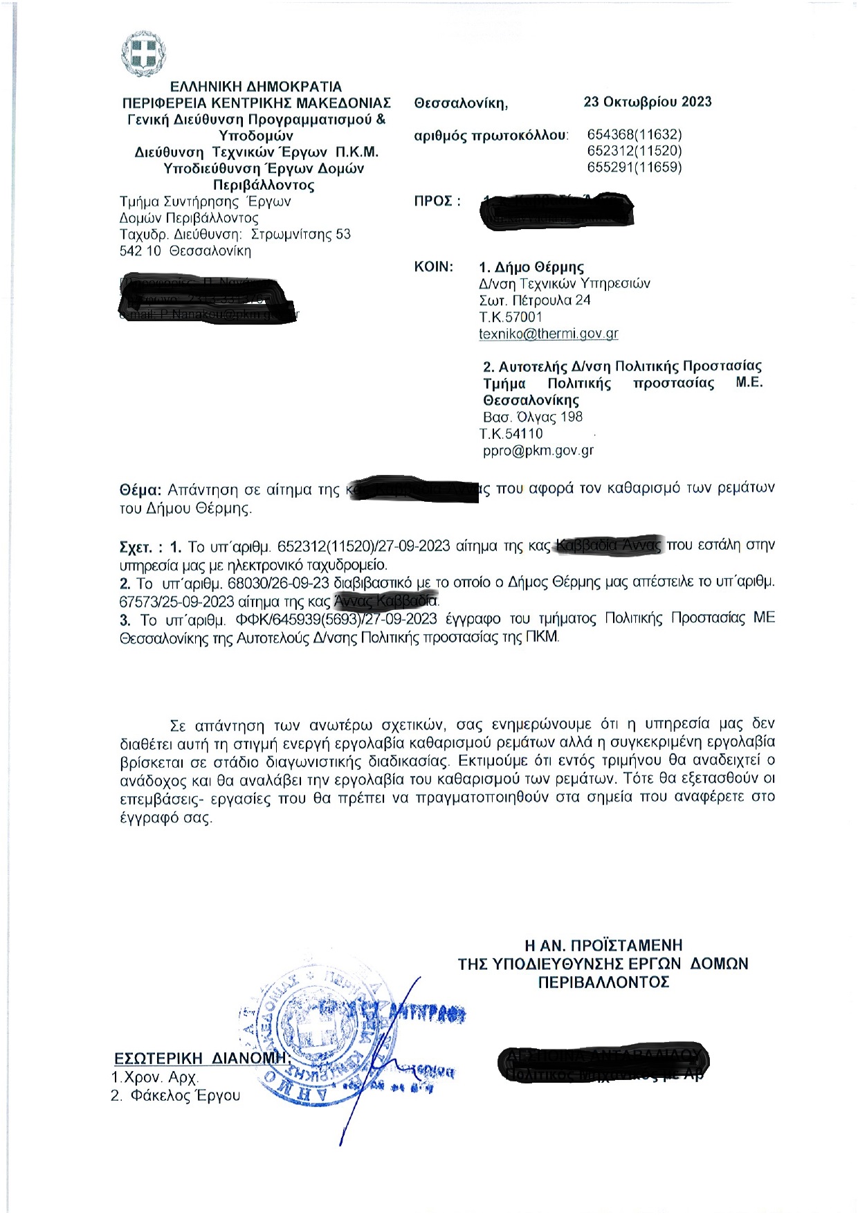 Ωστόσο, η πραγματικότητα διαφέρει από τις εξαγγελίες των υπευθύνων. Η κάτοικος του δήμου Θέρμης Άννα Καββαδία, διαπιστώνοντας ότι τα ρέματα του δήμου και της περιοχής της έχουν γεμίσει χόρτα και διάφορα υλικά, και φοβούμενη ότι σε περίπτωση μεγάλη βροχόπτωσης ο κίνδυνος πλημμύρας είναι ορατός, απευθύνθηκε στην αρμόδια υπηρεσία της Περιφέρειας Κεντρικής Μακεδονίας και η απάντηση της υπηρεσίας ήταν άκρως αποκαλυπτική.