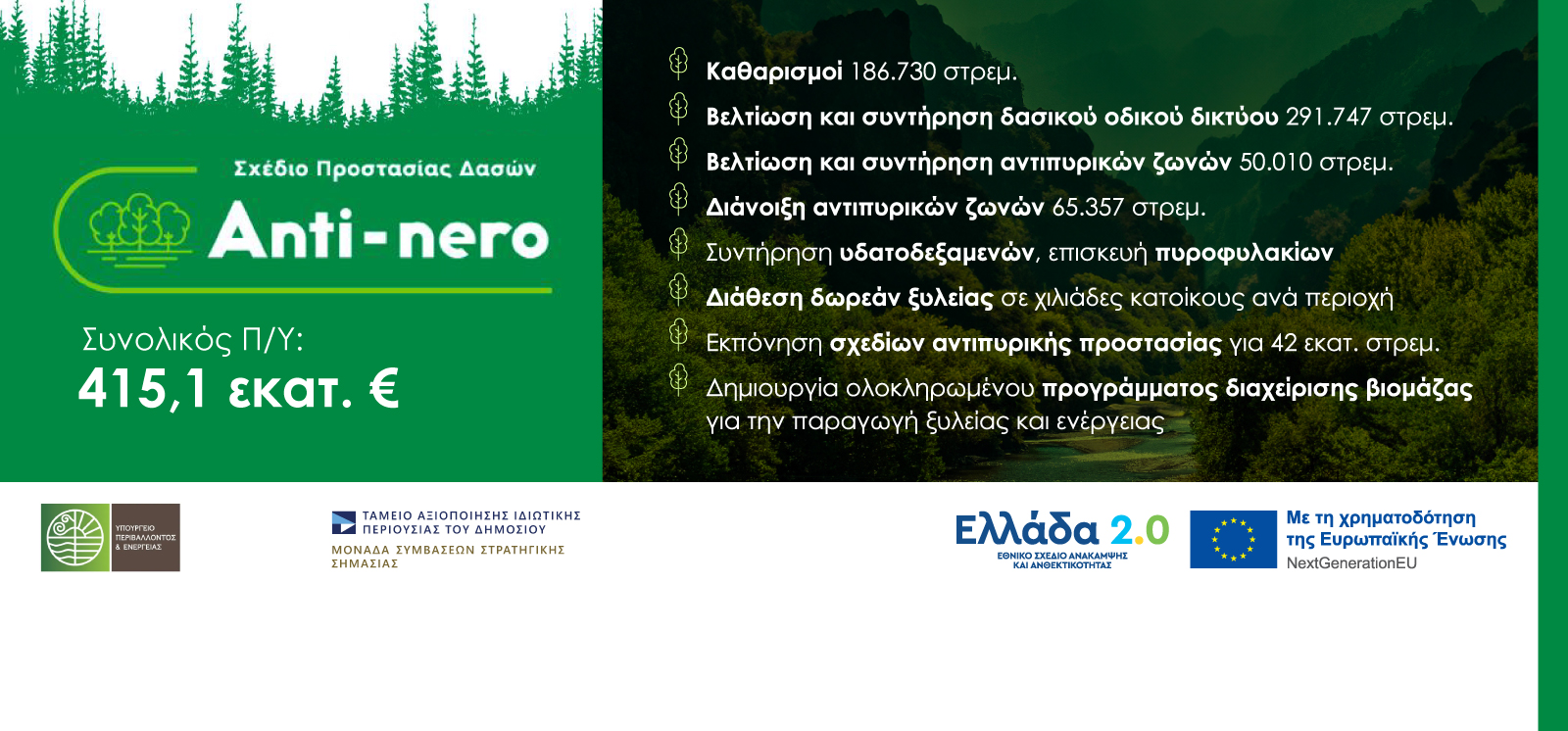 «Τα προγράμματα AntiNero I, II και ΙΙI αποτελούν βασικά εργαλεία για την πρόληψη και την προστασία των δασών της Ελλάδας και βρίσκονται σε πλήρη εξέλιξη σε πληθώρα περιοχών της χώρας.