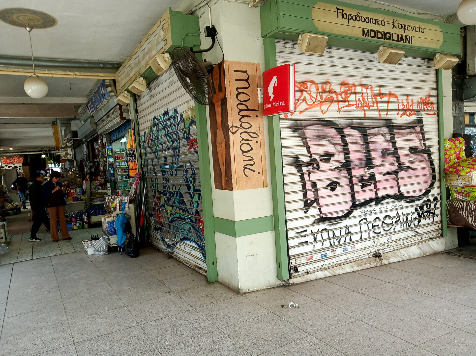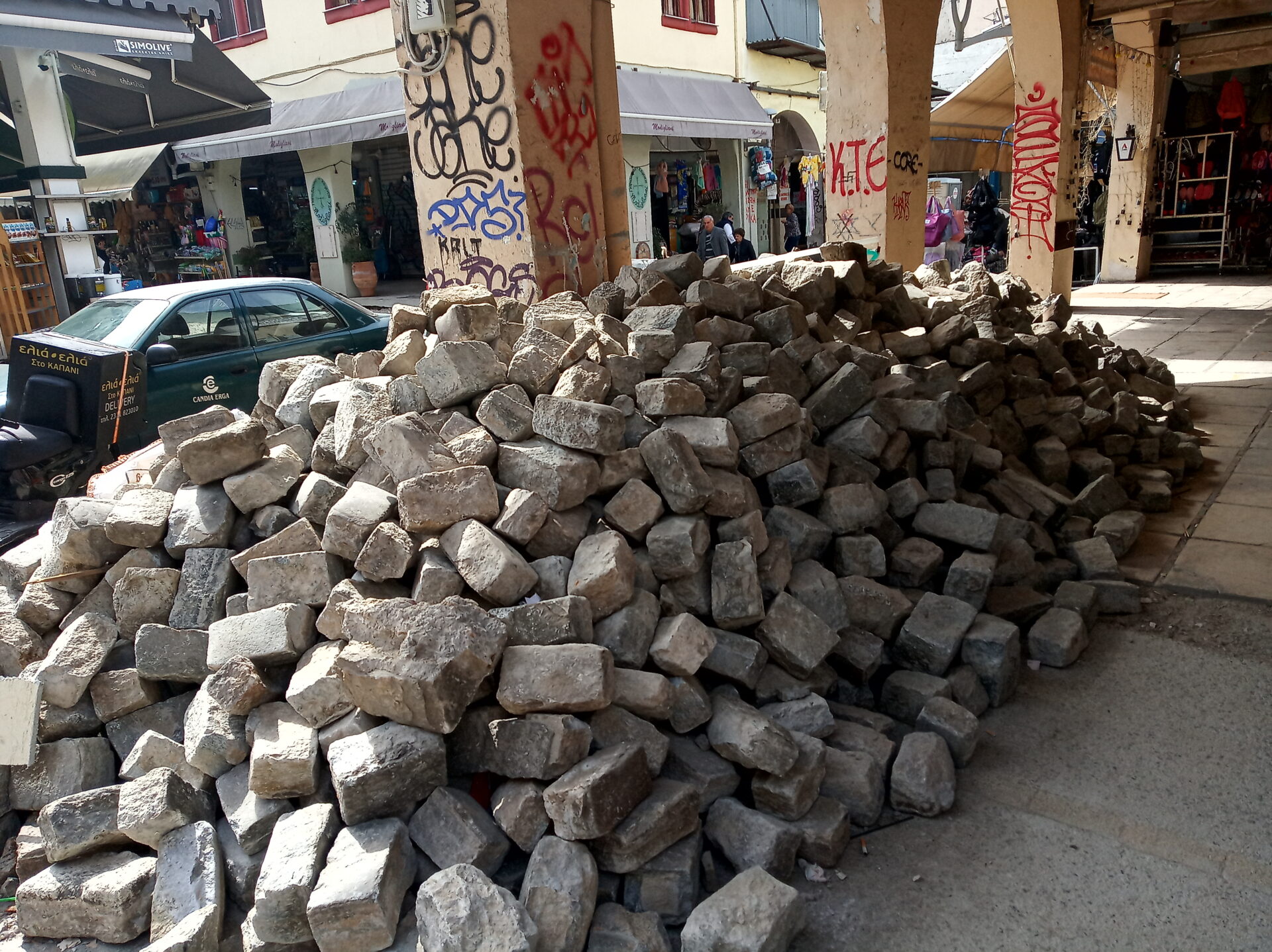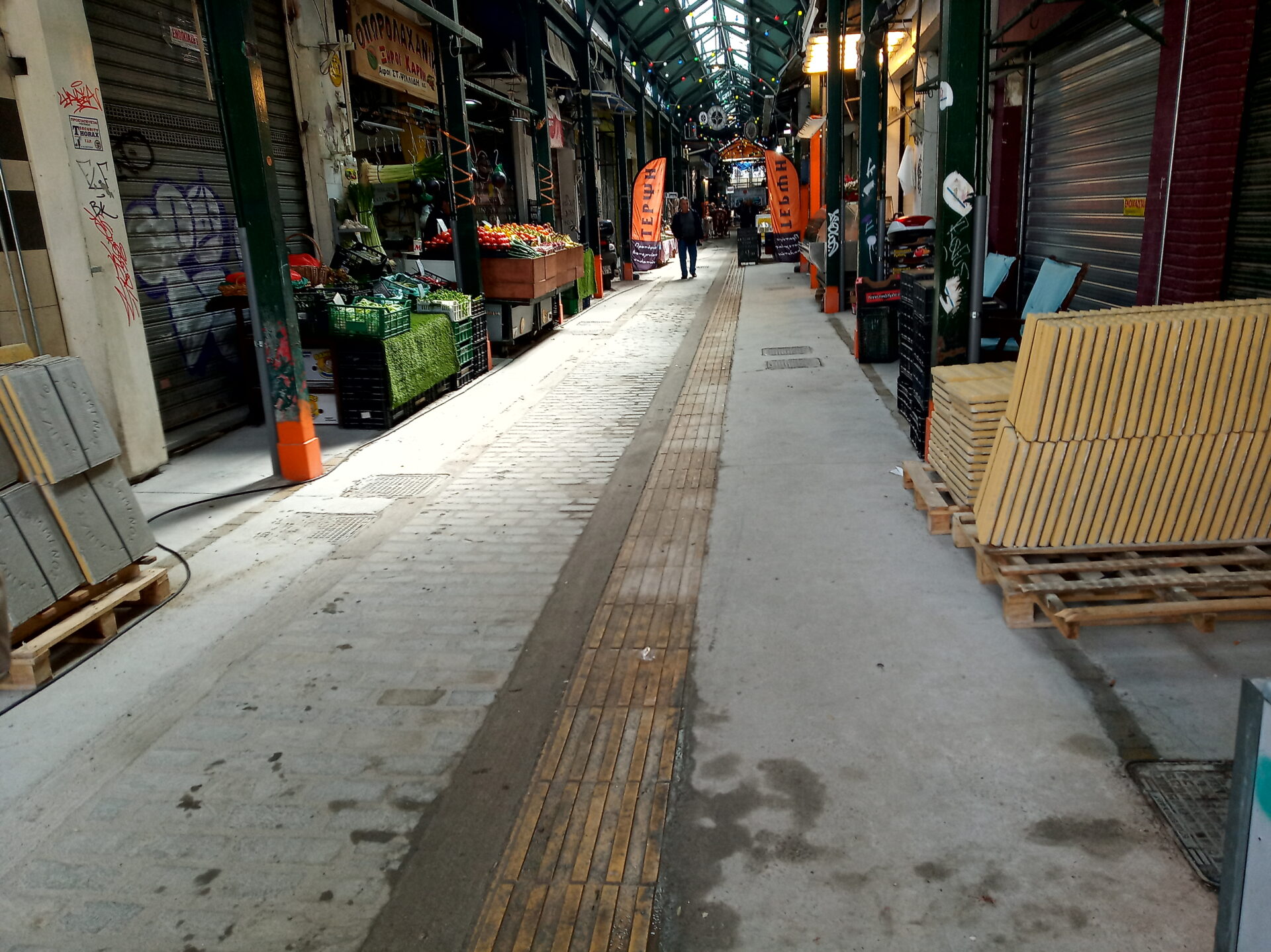 Μάλιστα σε κάποια σημεία όπου τα έργα αποχέτευσης έχουν ολοκληρωθεί, όπως στο κεντρικό σημείο όπου βρίσκονταιται τα καταστήματα που κατά κύριο λόγο πωλούν ελιές, ξηρούς καρπούς κ.α., τα δρομάκια παραμένουν με το χαλίκι ενώ παραδίπλα υπάρχουν ντάνες με κυβόλιθους. Λόγω της σκόνης και της ακαταλληλότητας των συνθηκών, δύο μεζεδοπωλεία, που βρίσκονται στο συγκεκριμένο σημείο της αγοράς είναι κλειστά, ενώ λουκέτο για 10 ημέρες περίπου, το προηγούμενο διάστημα, είχαν βάλει και άλλα καταστήματα λόγω των έργων.