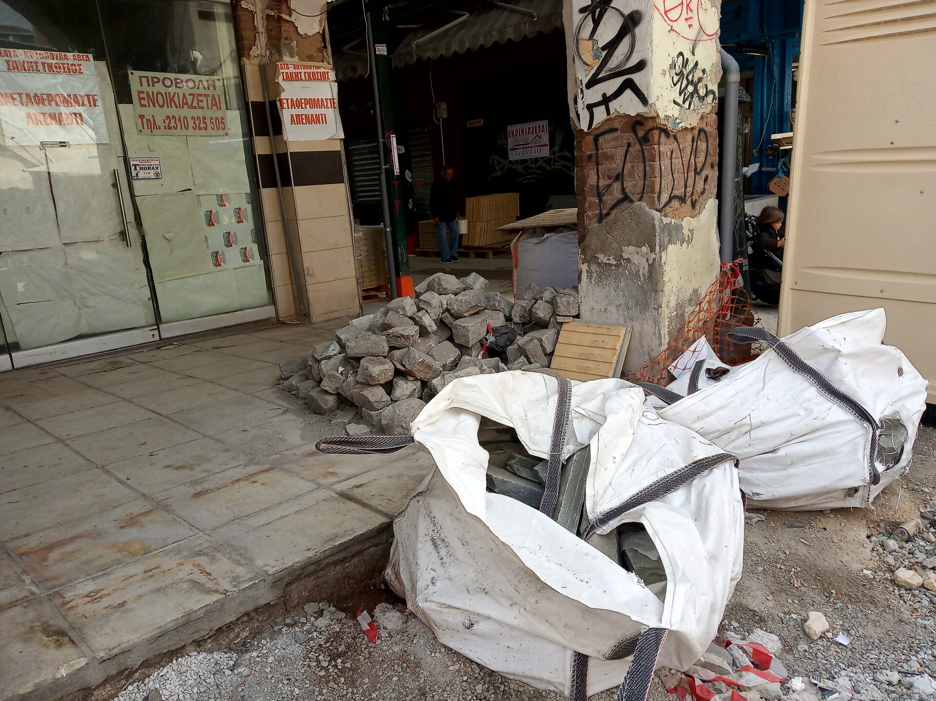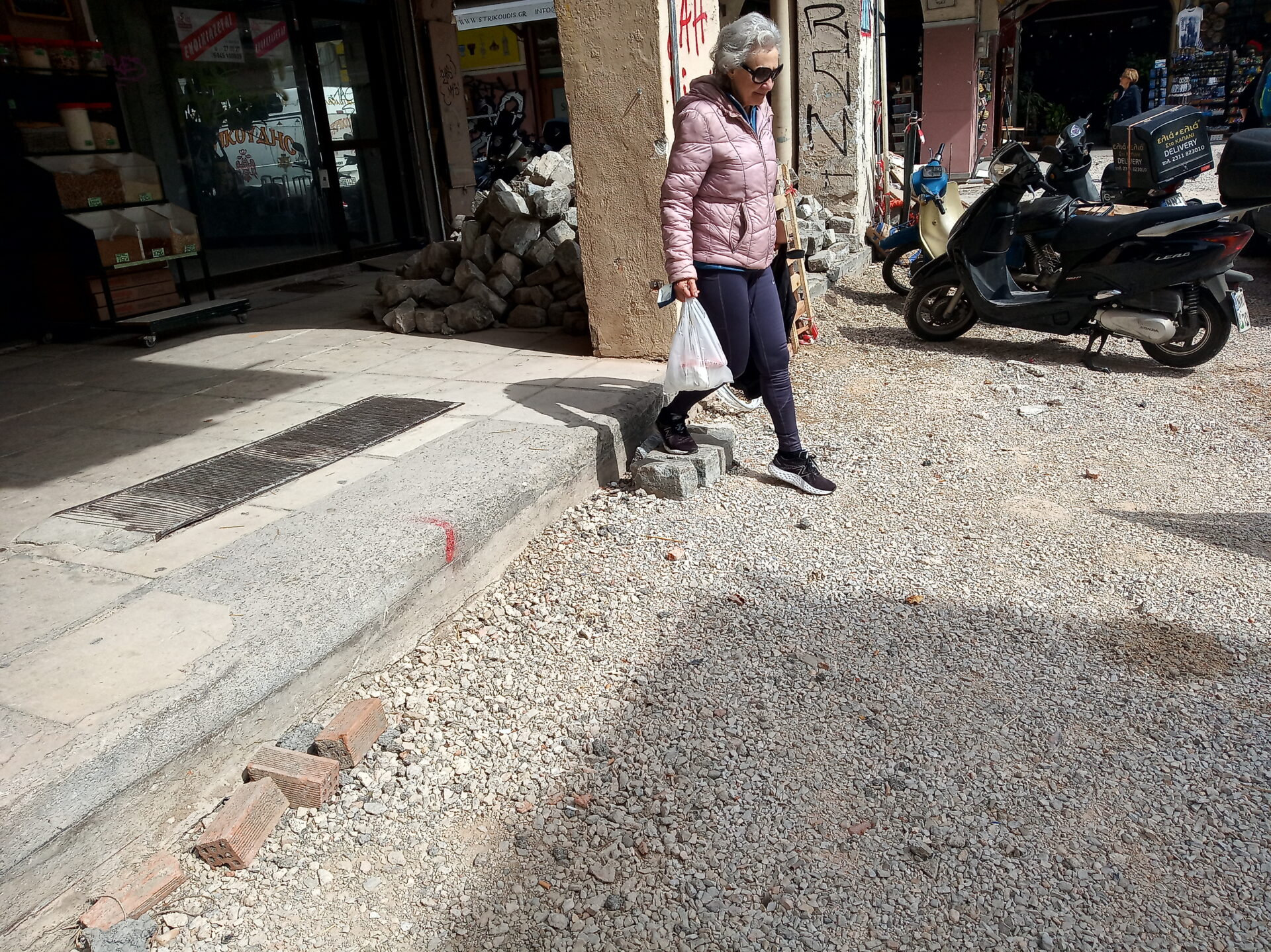 Κάποια καταστήματα, καθώς έχει «ξηλωθεί» το οδόστρωμα και έχει «κατέβει» ο δρόμος, έχουν τοποθετήσει κυβόλιθους για σκαλοπάτια, ώστε να διευκολύνεται η πρόσβαση. Σε πολλά σημεία υπάρχουν ανοιχτές και ημιτελείς εργασίες που εγκυμονούν ακόμα και κινδύνους ενώ οι εργασίες εκτελούνται την ώρα λειτουργίας των καταστημάτων, με τους καταναλωτές να περνούν δίπλα από τα συνεργεία.