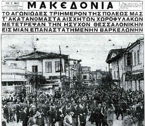Σ’ ένα ζοφερό πολιτικό κλίµα η απεργία των καπνεργατών που ξεκίνησε στις 29 Απριλίου 1936 γενικεύεται και στις 9 Μαΐου επικρατεί πανδαιµόνιο. Η χωροφυλακή συγκρούεται µε τους απεργούς και ο αυτοκινητιστής Τάσος Τούσης είναι ο πρώτος από τους 11 νεκρούς της ηµέρας. Λίγους µήνες αργότερα επιβάλλεται δικτατορία από τον Ιωάννη Μεταξά.