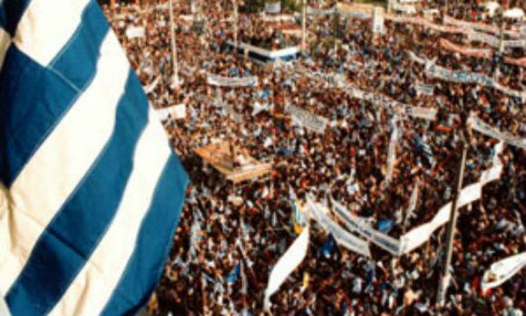 Σ’ ένα τεταµένο πολιτικά κλίµα µε την κυβέρνηση Μητσοτάκη να προσπαθεί να διαχειριστεί το θέµα των Σκοπίων και την ΠΓ∆Μ αποστέλλει αίτηµα στον ΟΗΕ ν’ αναγνωριστεί ως «∆ηµοκρατία της Μακεδονίας», ο τέως δήµαρχος Θεσσαλονίκης Ντίνος Κοσµόπουλος διοργανώνει το Παµµακεδονικό Συλλαλητήριο για το Σκοπιανό στις 14 Φεβρουαρίου 1992. Οι διοργανωτές κάνουν λόγο για ένα εκατοµµύριο συµµετέχοντες και παρά τις χρόνιες διαβουλεύσεις η υπόθεση παραµένει άλυτη. Χρυσές δουλειές έκαναν εκείνη τη µέρα όσοι πουλούσαν πλαστικές σηµαίες.