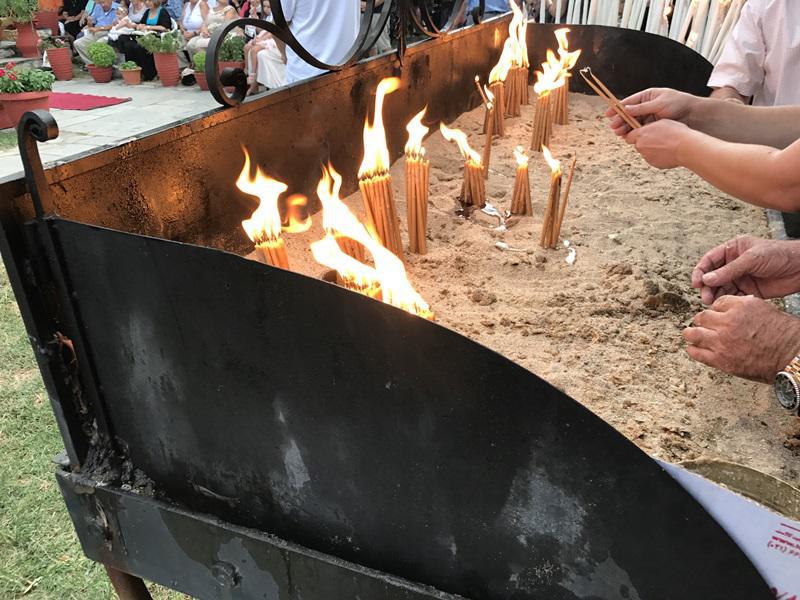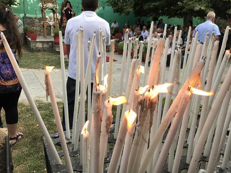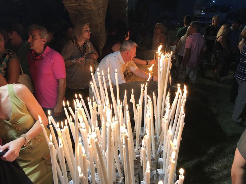 Ο κόσμος μετά την λειτουργία περνάει απέναντι για να χαζέψει να ψωνίσει να κάνει την βόλτα του και στριμώχνεται περνώντας από τους στενούς διαδρόμους. Δεν έλειψαν και τα (ευχάριστα) απρόοπτα όταν εγκυμονούσα Γερμανίδα τουρίστρια διακομίστηκε στο νοσοκομείο για να γεννήσει μιας και σπάσανε τα νερά της μέσα στο πανηγύρι. Ένα παιδί ήρθε στο κόσμο σχεδόν μέσα σε ψαλμωδίες, μουσικές φωνές , φώτα και χρώματα.