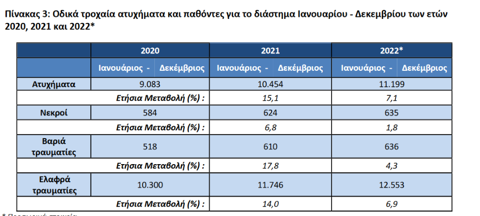 Το πρώτο δεκάμηνο 2023 είχαμε στην Ελλάδα 518 νεκροί ενώ το 2022 έκλεισε με ένα τραγικό απολογισμό: σύμφωνα με στοιχεία Διεύθυνσης Τροχαίας της Ελληνικής Αστυνομίας, στο σύνολο της επικράτειας, καταγράφηκαν 601 θανατηφόρα τροχαία ατυχήματα με 637 θύματα και 550 σοβαρά τροχαία με 628 βαριά τραυματίες.
