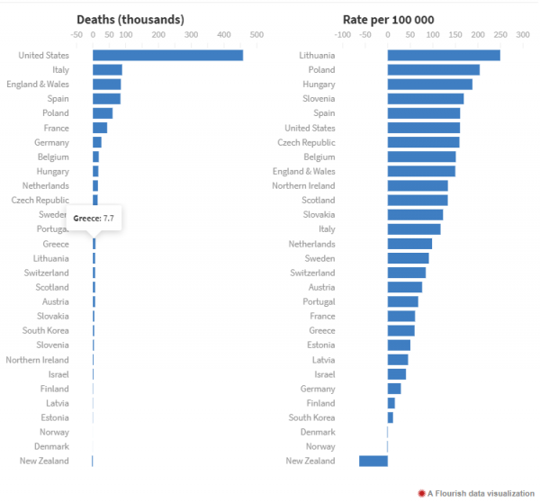 Από τις 29 χώρες μόνο τρεις (Νέα Ζηλανδία, Νορβηγία και Δανία) είχαν το 2020 λιγότερους θανάτους σε σχέση με τους αναμενόμενους.