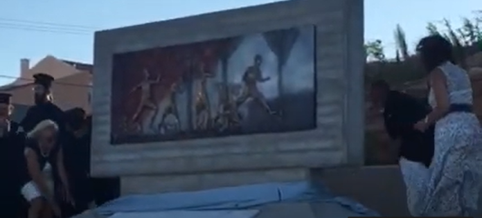 Έπειτα αποκαλύφθηκε το μνημείο, στο οποίο απεικονίζεται η προσπάθεια των ανθρώπων να σωθούν τρέχοντας, ενώ πίσω τους ακολουθούσε η φωτιά.