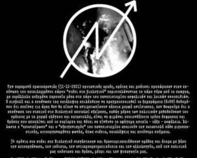 Την παραμονή Πρωτοχρονιάς κράτος και πρυτανικές αρχές αποφάσισαν να εισβάλουν, να εκκενώσουν και να διαλύσουν ένα κομμάτι της πολιτικής και όχι μόνο ιστορίας μας. Την πράξη αυτή ακολούθησαν οι ευχαριστίες του γνωστού ρουφιάνου Νικόλαου Παπαϊωάννου συνοδευόμενες από μιντιακή προπαγάνδα πρώτης τάξεως, έτοιμη για τον κάδο απορριμμάτων. Τις επόμενες μέρες διάφορα ρουφιανοκάναλα παρουσίαζαν πλάνα του στεκιού που απεικονίζουν μονάχα τους γκρεμισμένους τοίχους και τα καταπατημένα βιβλία μας, ισχυριζόμενα πως έτσι υπάρχουμε εμείς μέσα στους χώρους μας. Μάλλον μπερδεύτηκαν γιατί σε κανένα πλάνο δεν θα μπορούσε να υπάρξει έστω ένα κομμάτι της αντι-εμπορευματικής κουλτούρας μας, μιας συλλογικής κουζίνας, μιας βιβλιοπαρουσίασης ή μιας εκδήλωσης. Δεν τους θέλαμε πότε στις ζωές μας και θα συνεχίζουμε να υπερασπιζόμαστε την αυτοοργάνωση, την αλληλεγγύη, την συντροφικότητα και τον αγώνα ενάντια στις εκμετάλλευση της ύπαρξης μας μακριά από τις λογικές τους. Σήμερα 10 / 01 βρισκόμαστε ανάμεσα σε νέους τοίχους στο κτήριο πίσω από το Χημικό ΑΠΘ (παρκινγκ). Το είπαμε και θα το ξαναπούμε πως οι αγώνες μας δεν εκκενώνονται και καμία καταστολή δεν μπορεί να μας σταματήσει από το να τρυπώνουμε παντού. Το Στέκι στο Βιολογικό ήταν και θα είναι κατάληψη για πάντα.