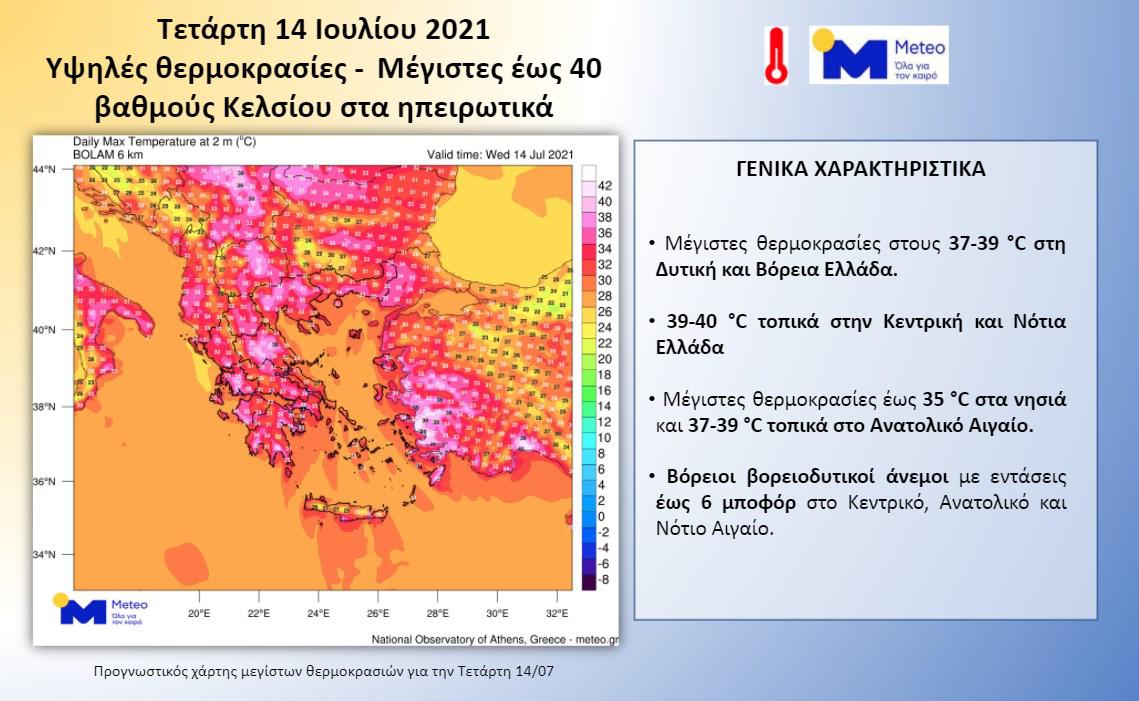 Οπως αναφέρουν τα προγνωστικά στοιχεία του Εθνικού Αστεροσκοπείου Αθηνών / meteo.gr, η θερμοκρασία αναμένεται να παρουσιάσει μικρή περαιτέρω άνοδο σήμερα (14.07.2021) φτάνοντας κατά τόπους στα ηπειρωτικά τους 39-40 βαθμούς Κελσίου.