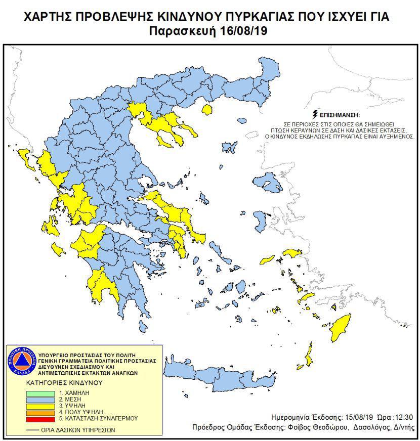 Σύμφωνα με την ανακοίνωση της Γενικής Γραμματείας Πολιτικής Προστασίας και τον Χάρτη Πρόβλεψης Κινδύνου Πυρκαγιάς που ισχύει για σήμερα Παρασκευή 16.08.19: