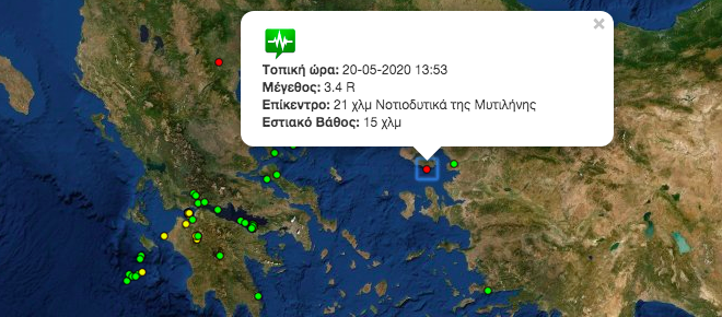 Σεισμική δόνηση έντασης σύμφωνα με την πρώτη μέτρηση του γεωδυναμικού Ινστιτούτου Αθηνών 3,2 βαθμών της κλίμακας Ρίχτερ σημειώθηκε σήμερα στις 2 παρά 5 το μεσημέρι στο θαλάσσιο χώρο 20 μόλις χιλιόμετρα νότια της πόλης της Μυτιλήνης.