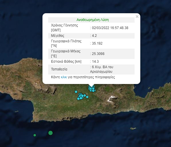 Δείτε επίσης:ο σεισμός είχε εστιακό βάθος τα 14,3 χλμ., ενώ είχε επίκεντρο τα 6 χλμ., Βορειοανατολικά του Αρκαλοχωρίου.