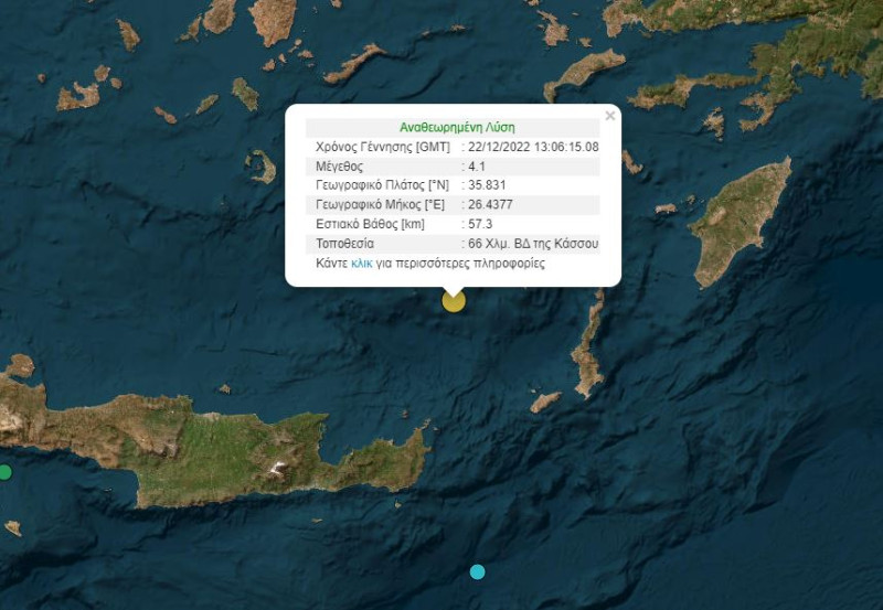 Σεισμική δόνηση μεγέθους 4,1 βαθμών της κλίμακας Ρίχτερ σημειώθηκε στη θαλάσσια περιοχή ανάμεσα σε Κάσο, Κάρπαθο και Κρήτη.
