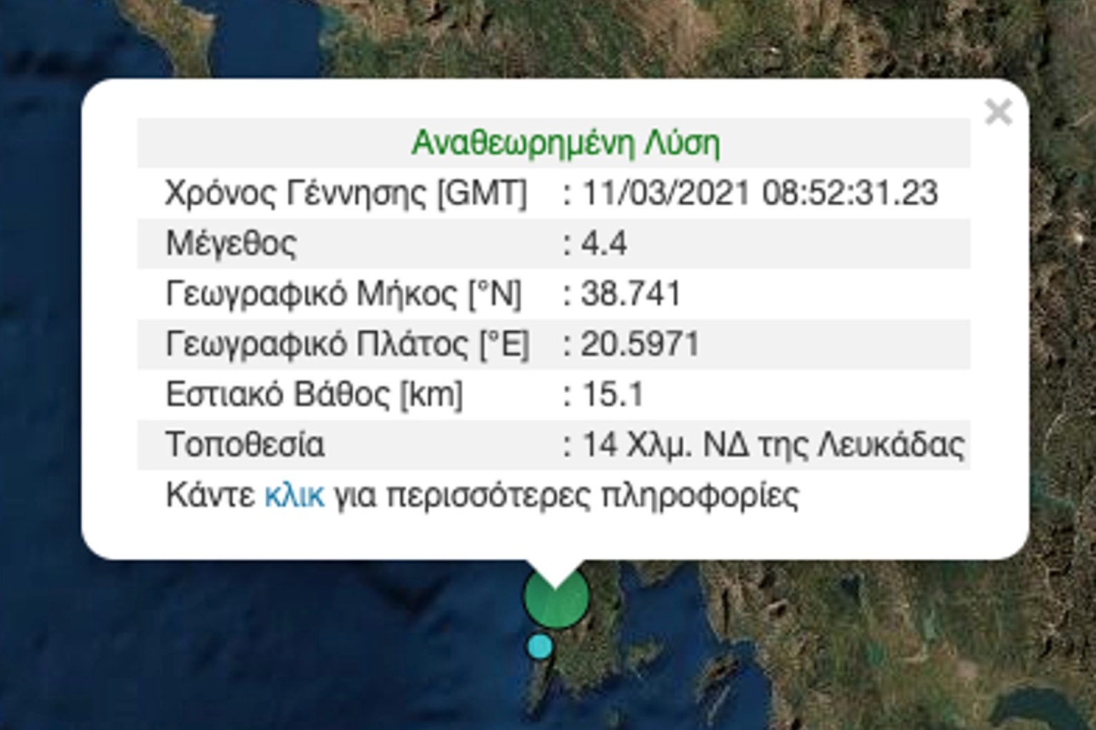 Σεισμός 4,4 ρίχτερ έγινε λίγα λεπτά πριν τις 11 το πρωί στην Λευκάδα. Ο σεισμός είχε εστιακό του βάθος ήταν 15,1 χιλιόμετρα. Το επίκεντρο ήταν 14 χιλιόμετρα νοτιοδυτικά της Λευκάδας.