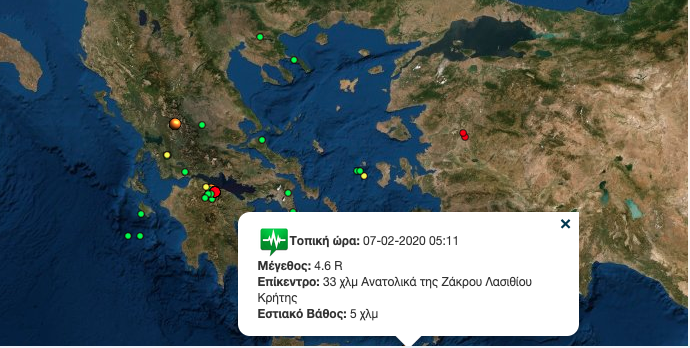 Νέα σεισμική δόνηση, μεγέθους 4,6 βαθμών της κλίμακας Ρίχτερ, σημειώθηκε στις 05:11 στον θαλάσσιο χώρο μεταξύ των νησιών της Κρήτης και της Κάσου, σε απόσταση 33 χιλιομέτρων ανατολικά της Ζάκρου, ενημέρωσε το Γεωδυναμικό Ινστιτούτο του Εθνικού Αστεροσκοπείου Αθηνών με ανακοίνωση που διένειμε σε μέσα ενημέρωσης μέσω ηλεκτρονικού ταχυδρομείου.