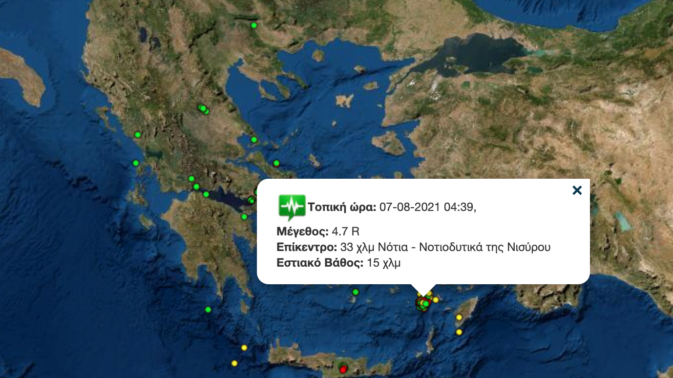 Νέα σεισμική δόνηση, μεγέθους 4,7 στην κλίμακα Ρίχτερ, σημειώθηκε τα ξημερώματα στο θαλάσσιο χώρο της Νισύρου. Εκ μέρους των τεσσάρων φορέων συγκρότησης του Ενιαίου Εθνικού Σεισμολογικού Δικτύου, το Γεωδυναμικό Ινστιτούτο του Εθνικού Αστεροσκοπείου Αθηνών ανακοίνωσε ότι σήμερα, στις 04:39, το σεισμολογικό δίκτυο κατέγραψε ασθενή σεισμική δόνηση με μέγεθος 4.7 στην κλίμακα Ρίχτερ. Ο σεισμός έγινε σε απόσταση 347 χλμ ΑΝΑ των Αθηνών.