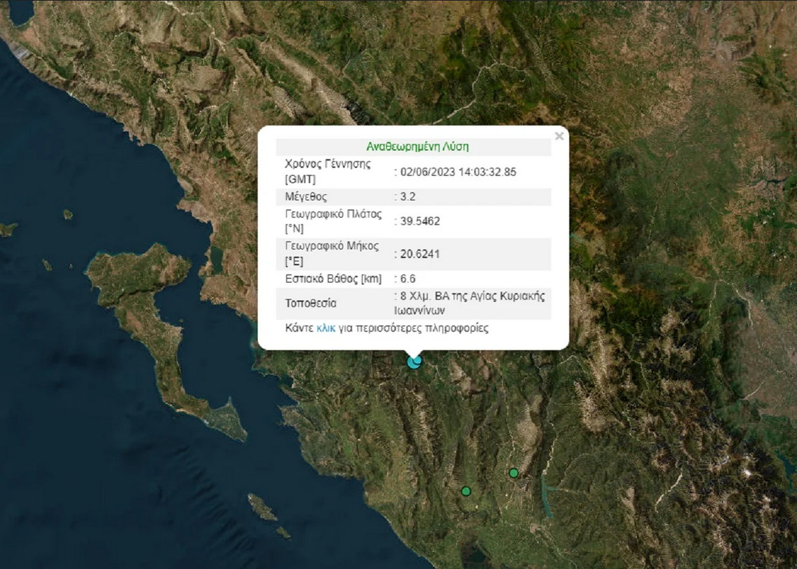 Ο σεισμός έγινε σε εστιακό βάθος 6,6 χιλιομέτρων. Το επίκεντρο του σεισμού στα Ιωάννινα εντοπίζεται 8 χλμ ΒΑ της Αγίας Κυριακής Ιωαννίνων.