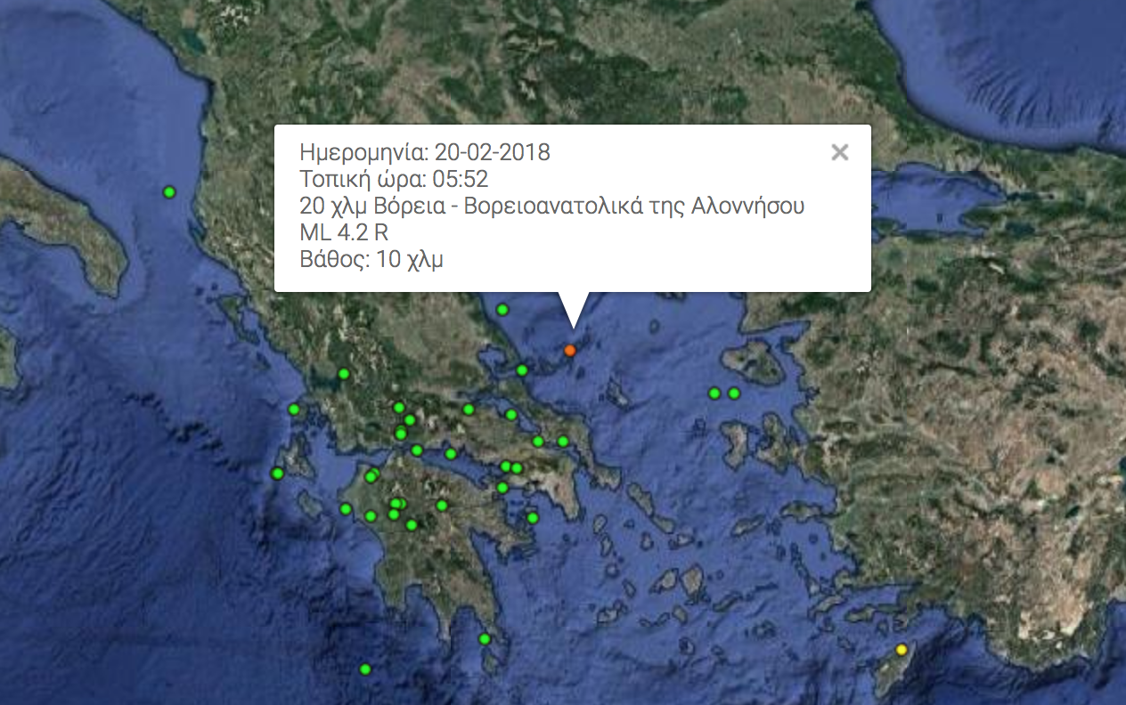 Το επίκεντρο της δόνησης εντοπίζεται στον θαλάσσιο χώρο 16 χιλιόμετρα βόρεια/βορειοανατολικά της Αλοννήσου.
