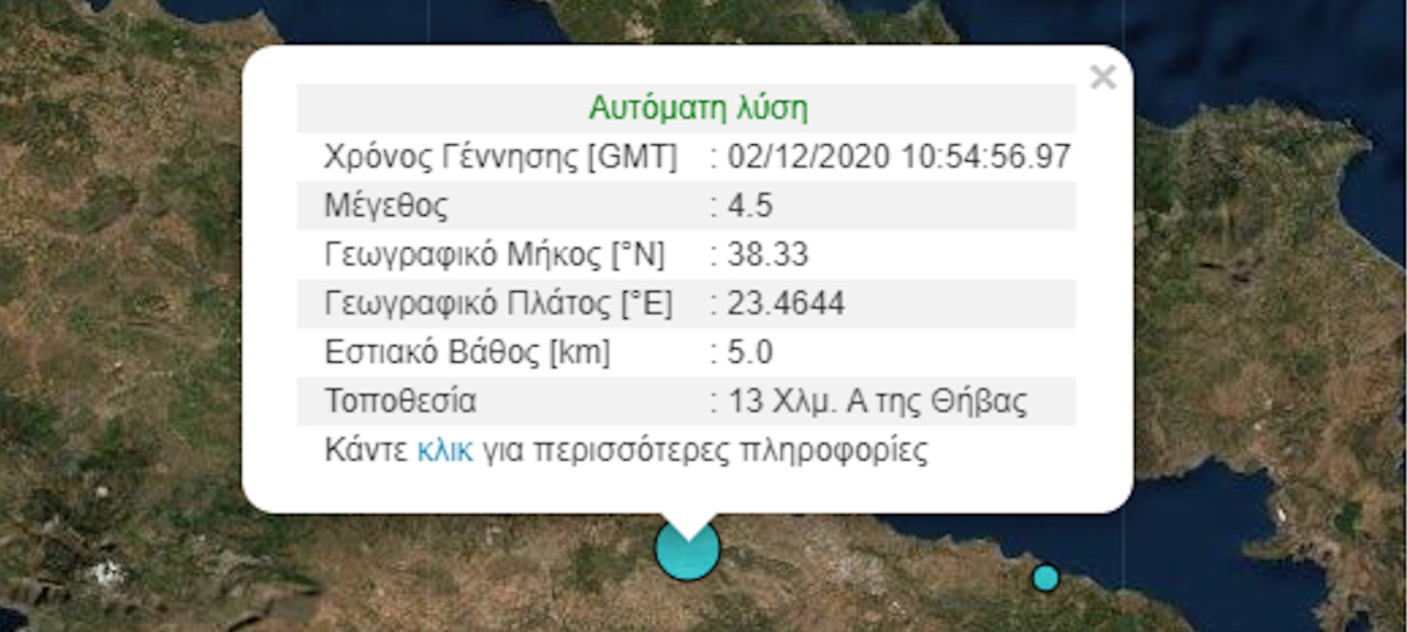 Σύμφωνα με το ευρωμεσογειακό ινστιτούτο ο σεισμός ήταν μεγέθους 4,5 βαθμών της κλίμακας ρίχτερ και το εστιακό του βάθος ήταν 5 χιλιόμετρα. Το επίκεντρό του εντοπίζεται 11 χιλιόμετρα ανατολικά της Θήβας.