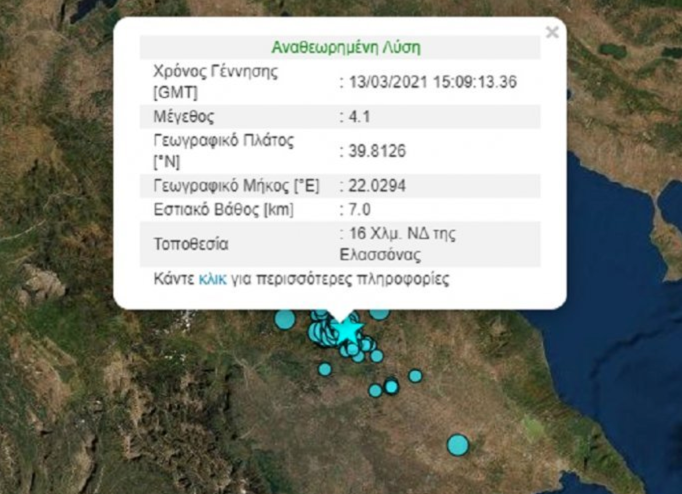 Νέος σεισμός 4,1 βαθμών της κλίμακας Ρίχτερ σημειώθηκε 10 περίπου λεπτά μετά τις 5 το απόγευμα του Σαββάτου στην Ελασσόνα, σύμφωνα με το Γεωδυναμικό Ινστιτούτο του Εθνικού Αστεροσκοπείου Αθηνών. Από τον νέο σεισμό στην Ελασσόνα δεν έχουν αναφερθεί μέχρι αυτή την ώρα ζημιές.