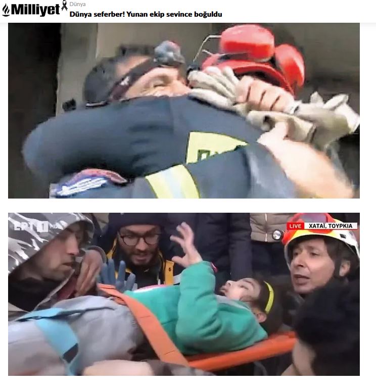 Με τον τίτλο, «Η ελληνική ομάδα πλημμυρισμένη από χαρά», η τουρκική εφημερίδα αναφέρει ότι «η Ελληνική Μονάδα Ειδικής Αντιμετώπισης Καταστροφών (ΕΜΑΚ) συμμετείχε στις προσπάθειες έρευνας και διάσωσης στην Αλεξανδρέττα. Η ΕΜΑΚ έβγαλε ζωντανούς από τα ερείπια τον 50χρονο πατέρα και την 6χρονη κόρη. Η χαρά που αισθάνθηκε η ελληνική ομάδα όταν έβγαλαν ζωντανό το κοριτσάκι από τα ερείπια άξιζε να δει κάποιος. Οι ελληνικές ομάδες, που αγκαλιάστηκαν για αρκετή ώρα, δεν μπορούσαν να συγκρατήσουν τα δάκρυα τους. Ο Ελληνας πρωθυπουργός Κυριάκος Μητσοτάκης μοιράστηκε στα τουρκικά στον λογαριασμό του στα μέσα κοινωνικής δικτύωσης: «Οι εικόνες που μας γεμίζουν πόνο διαδέχονται εικόνες που μας γεμίζουν ελπίδα. Έλληνες και Τούρκοι παλεύουν δίπλα δίπλα, μαζί για να σώσουν ζωές», είπε».