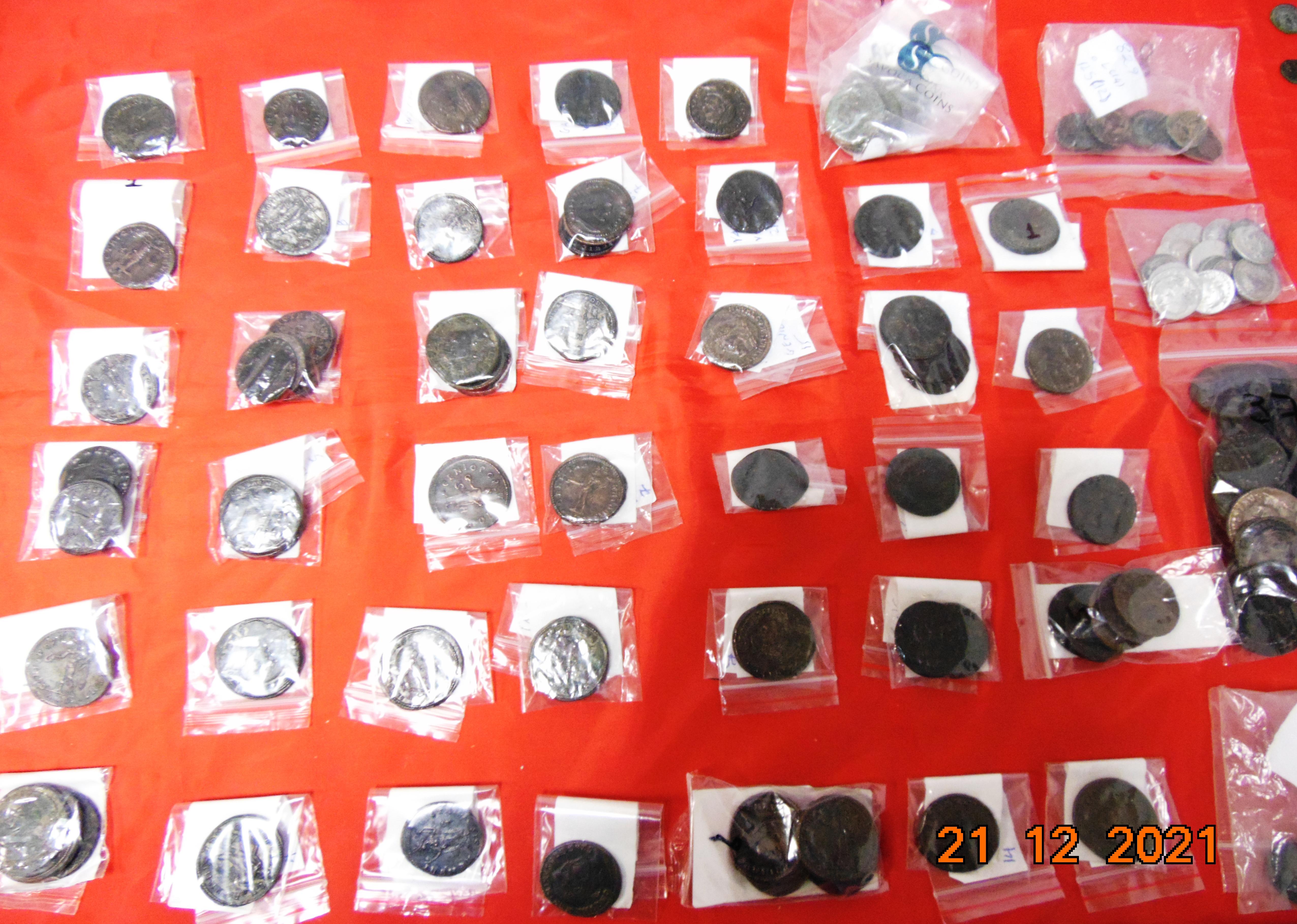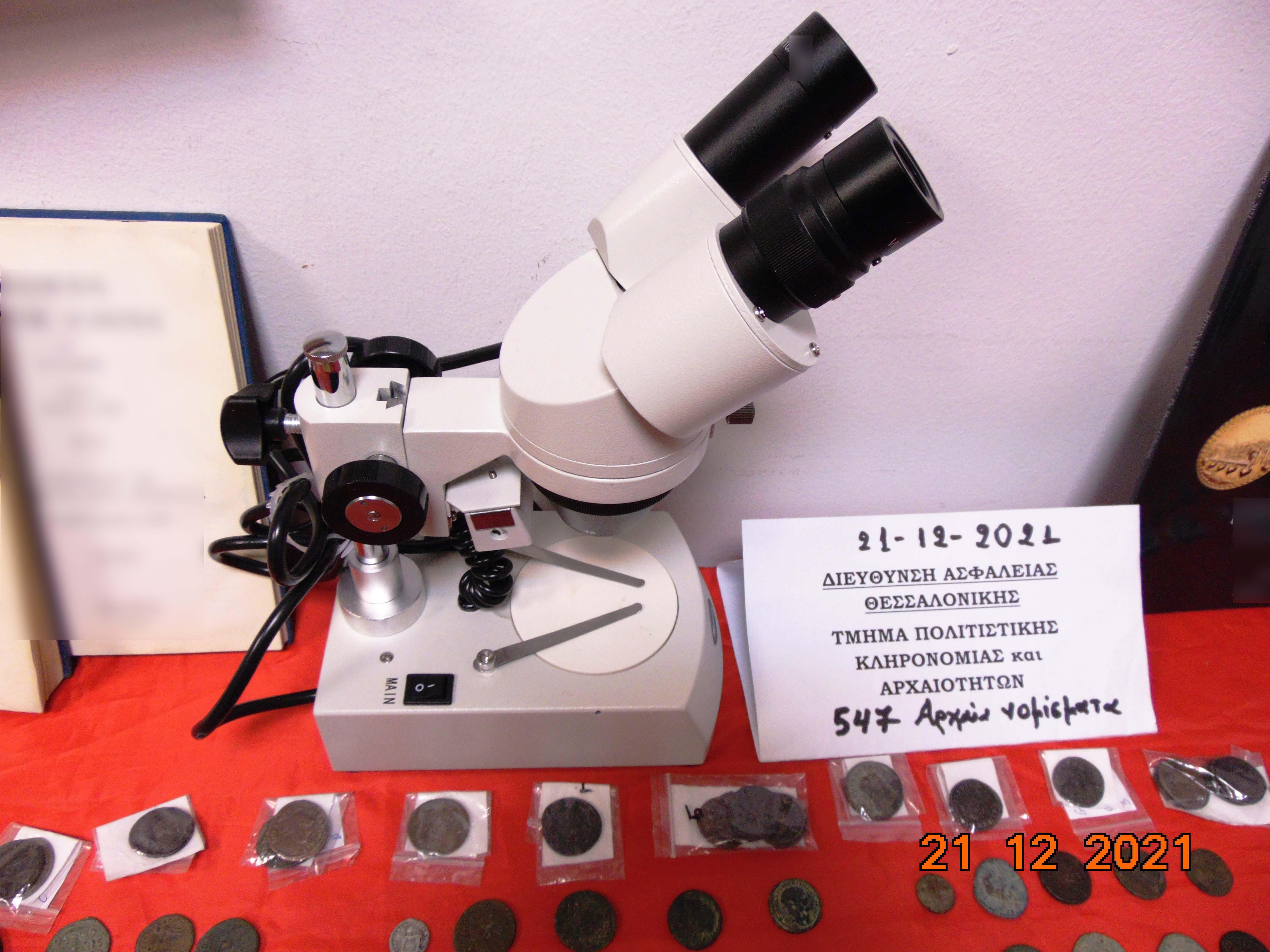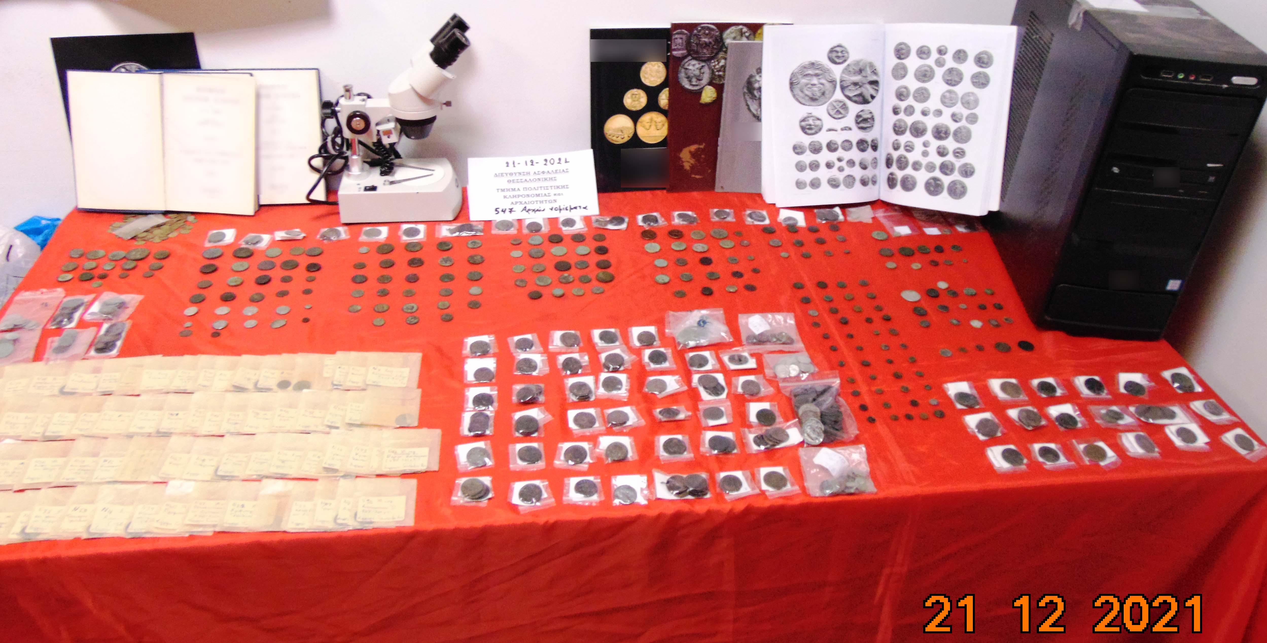 – (547) νομίσματα αναγόμενα στην αρχαιότητα, που χρονολογούνται από τον 4ο αιώνα π.Χ. και εμπίπτουν στις σχετικές προστατευτικές διατάξεις, – εργαλεία που χρησιμοποιούνται για τον καθαρισμό τους – πλήθος βιβλίων και εγγράφων με αντικείμενο τα αρχαία νομίσματα – ηλεκτρονικός υπολογιστής – (4) συσκευές αποθήκευσης usb και – κινητό τηλέφωνο.