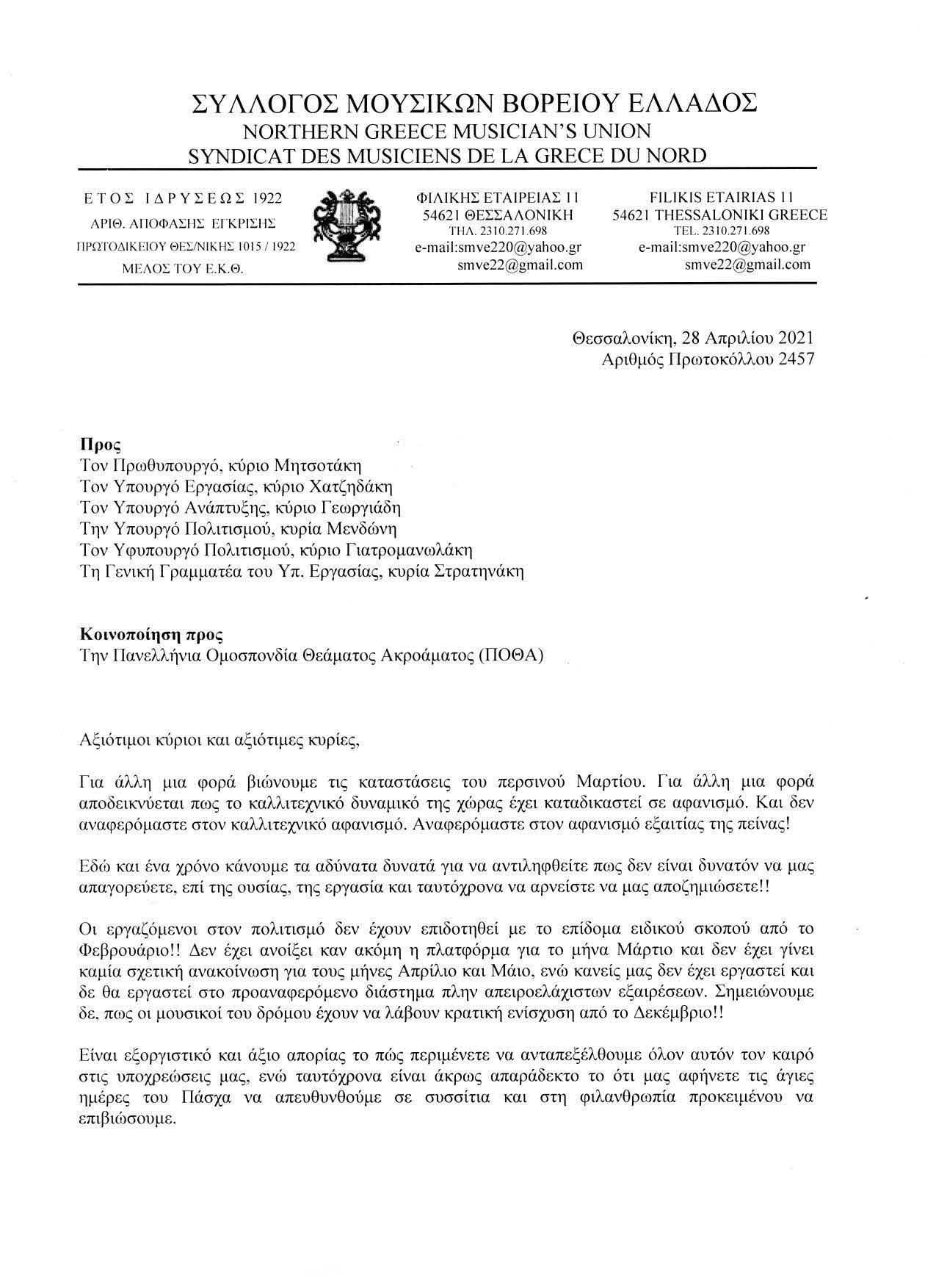 Ο Σύλλογος Μουσικών Βορείου Ελλάδος, με επιστολή του προς την κυβέρνηση, απαιτεί την επιδότηση των καλλιτεχνών αναδρομικά για όλους τους μήνες που δεν έχουν λάβει βοήθεια, καθώς και το άμεσο άνοιγμα της συζήτησης σχετικά με το “τι μέλλει γενέσθαι” για την περίοδο του καλοκαιριού, καθώς η απαγόρευση της μουσικής στην εστίαση προμηνύει ένα δυσοίωνο μέλλον για τον κλάδο.