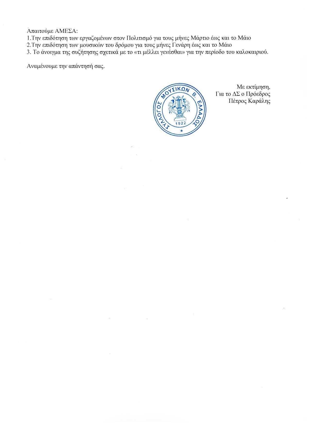 Τι ζητά ο Σύλλογος Μουσικών Βορείου Ελλάδος με επιστολή του από την κυβέρνηση;